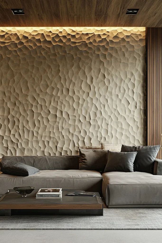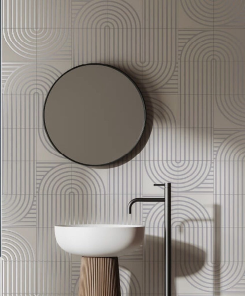 Gạch hoạ tiết nghệ thuật tông nâu – tạo mảng nhấn phòng khách rất “có gu”.Gạch vân đá/bê tông xám ốp mặt tiền – mạnh mẽ, sang kiểu kiến trúc hiện đại.