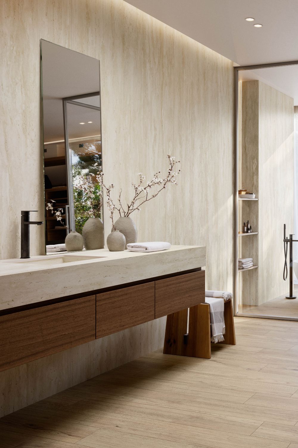 Mảng tường travertine + đèn hắt – tạo chiều sâu, cảm giác “resort vibe”.Bếp phối travertine tông kem – ấm áp, sang nhẹ và dễ lau chùi.