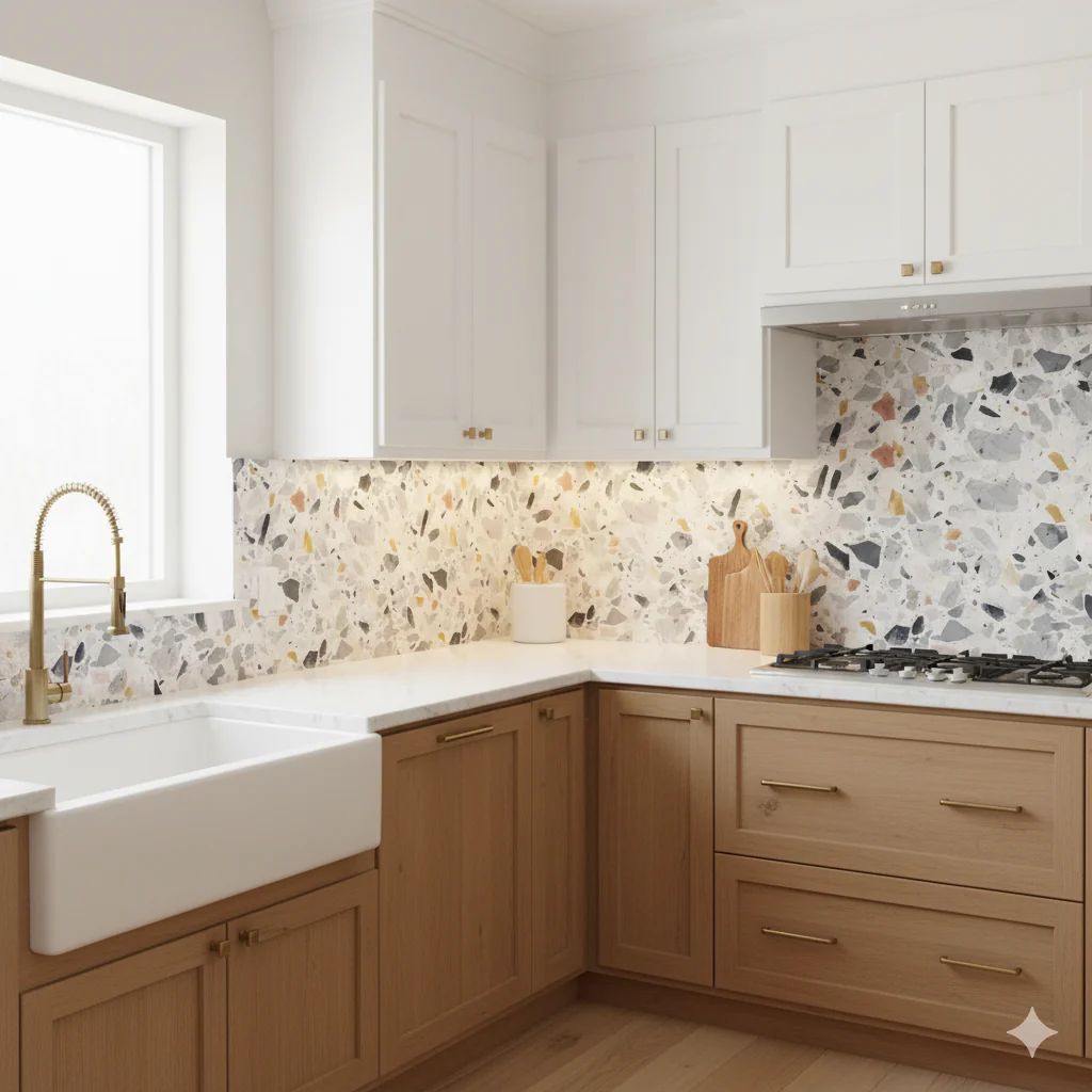Bếp ốp terrazzo hạt màu – backsplash nổi bật nhưng vẫn nhẹ nhàng.