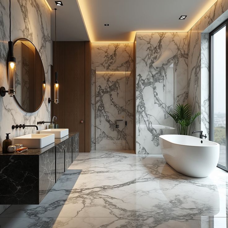 Phòng tắm ốp gạch vân marble trắng vân xám khổ lớn, bồn tắm độc lập và phụ kiện tông đồng.Phòng tắm tối giản ốp gạch vân onyx sáng màu, bề mặt bóng nhẹ, phối phụ kiện gỗ và lavabo hiện đại.Khu vực lavabo đôi ốp gạch vân marble trắng vân đen nổi bật, phối tủ lavabo xanh và gương khung kim loại.
