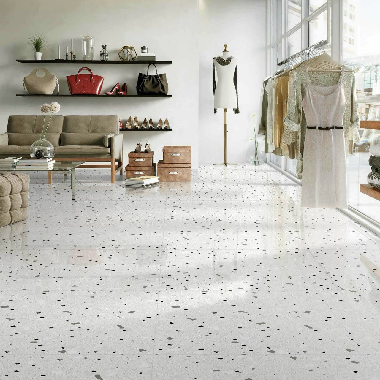 Nhờ kích thước lớn và họa tiết phân bố đều, gạch terrazzo 80×80 tạo mặt sàn gọn gàng, che khuyết điểm tốt và phù hợp với các không gian cần cá tính riêng.