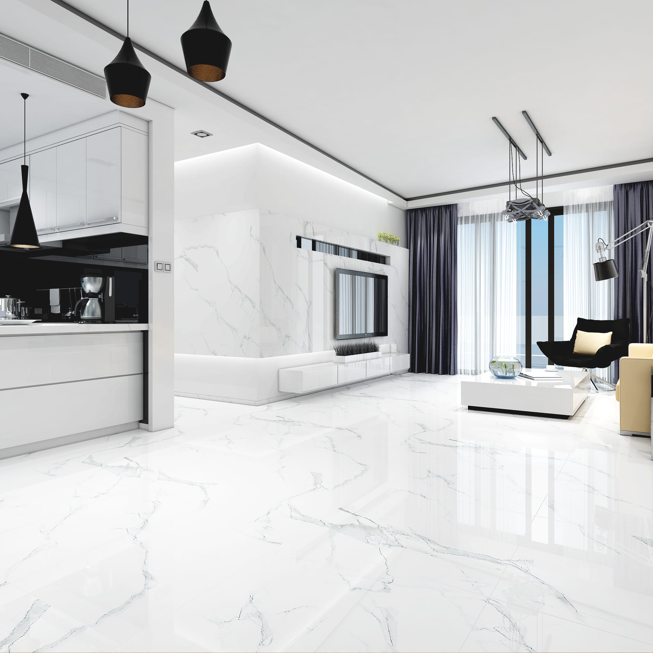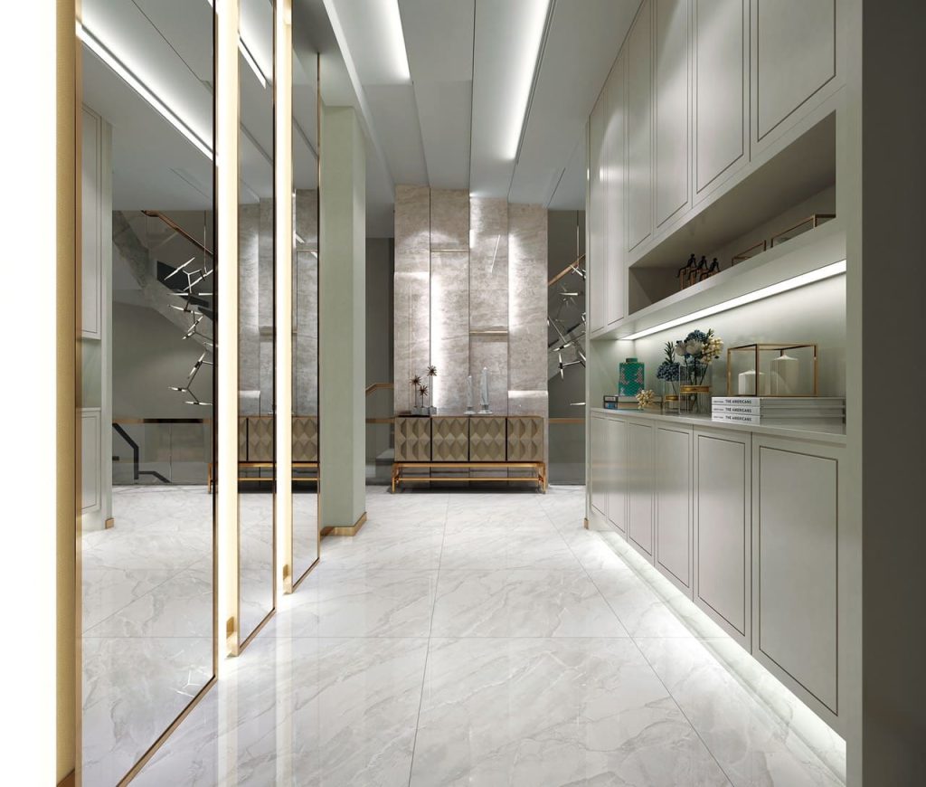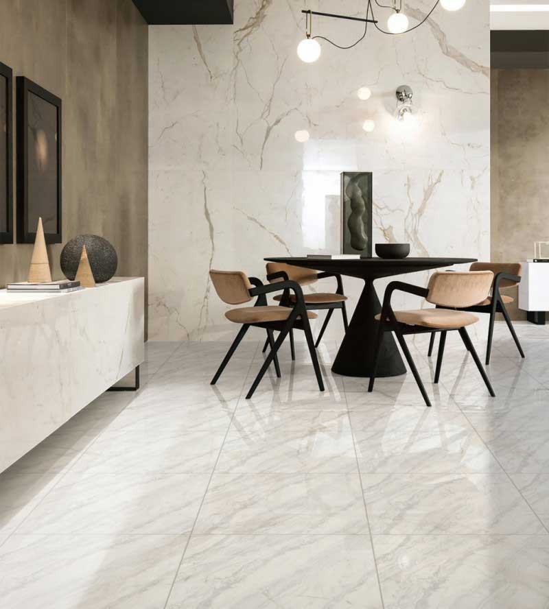 Các mẫu gạch vân marble thường có tông màu trắng, kem, xám hoặc be, dễ phối với nhiều phong cách nội thất từ hiện đại, bán cổ điển đến luxury.