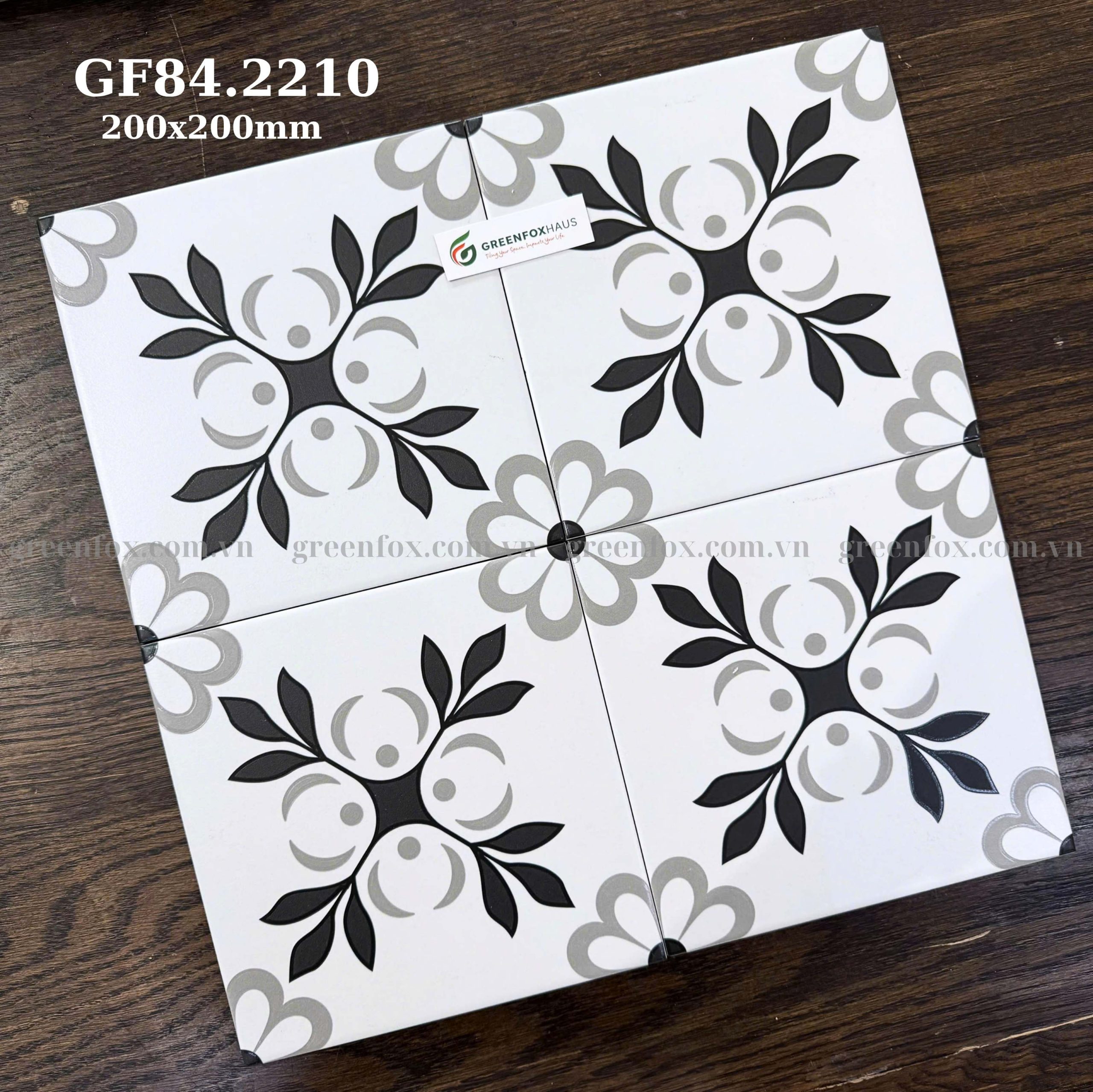 GF84.2210 là mẫu gạch bông trang trí nổi bật với thiết kế floral đối xứng mang đậm tinh thần cổ điển châu Âu, kết hợp hài hòa giữa nền trắng thanh lịch cùng các chi tiết đen và xám trung tính tạo nên tổng thể sang trọng nhưng không quá nặng nề. Bố cục họa tiết được xử lý cân đối giúp viên gạch khi ghép theo mảng lớn tạo thành layout đồng nhất, mang lại hiệu ứng thị giác đẹp mắt và chiều sâu cho toàn bộ không gian.
