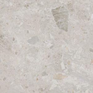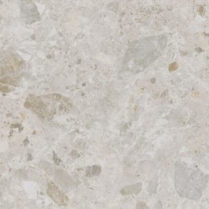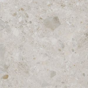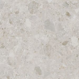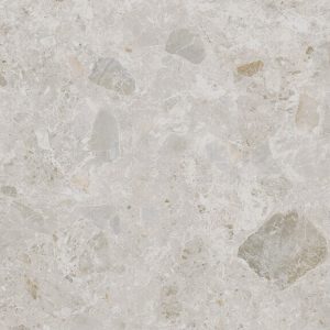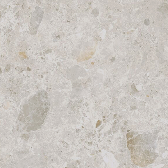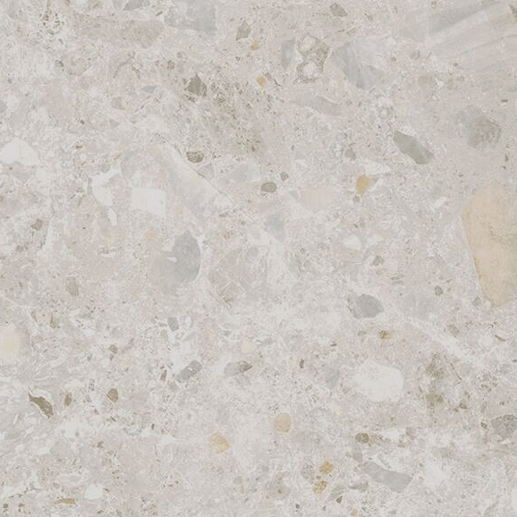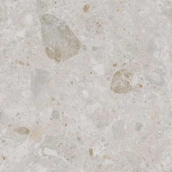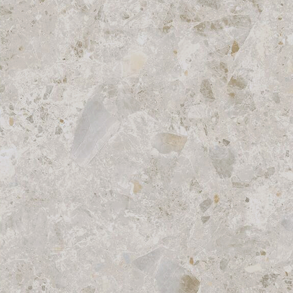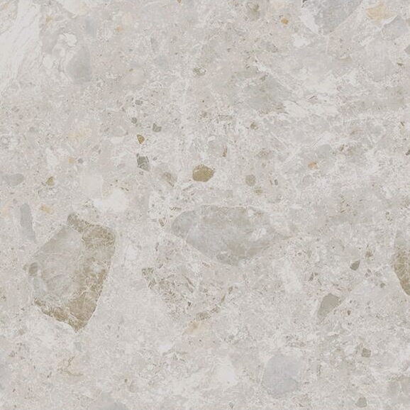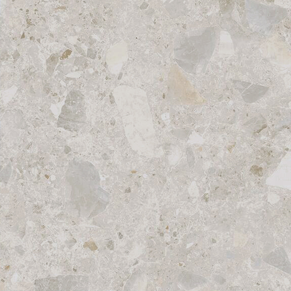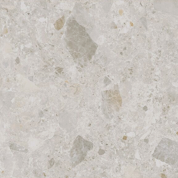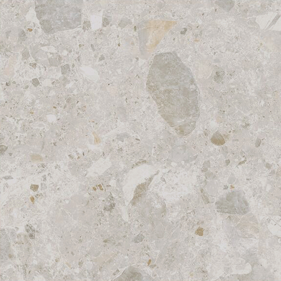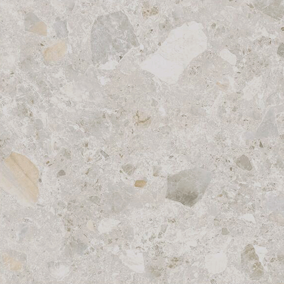 Kiểu vân: Vân đá terrazzo/breccia hạt nhẹ, tông xám kem sáng tự nhiên