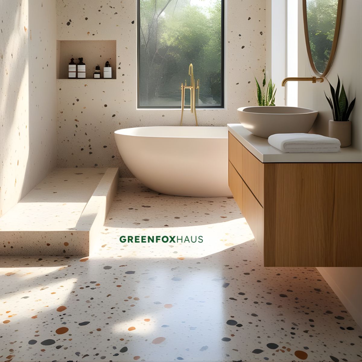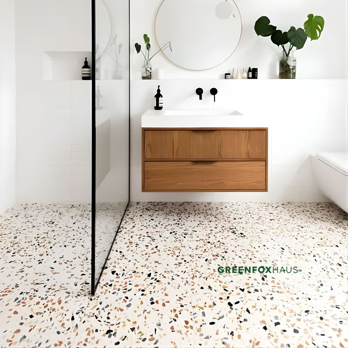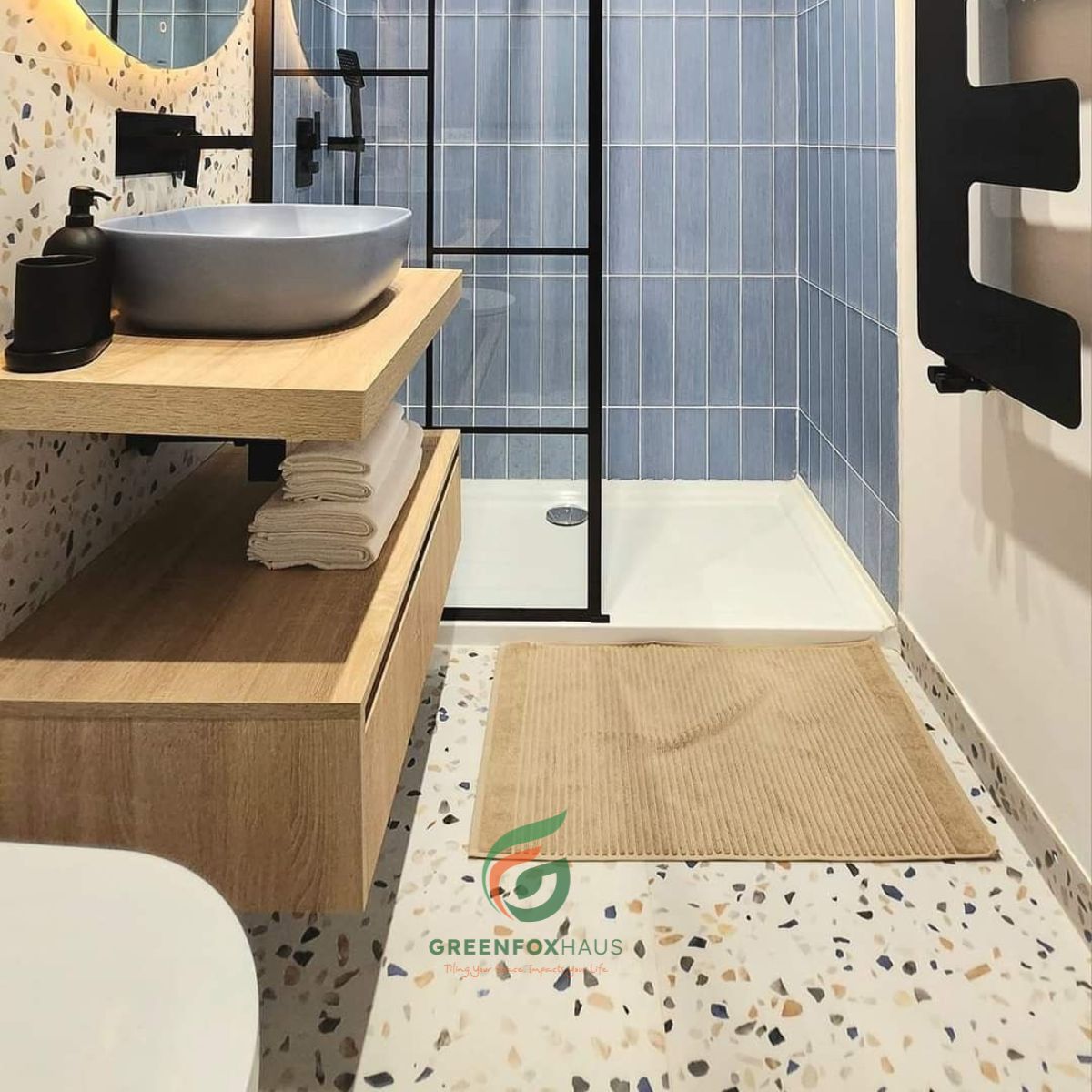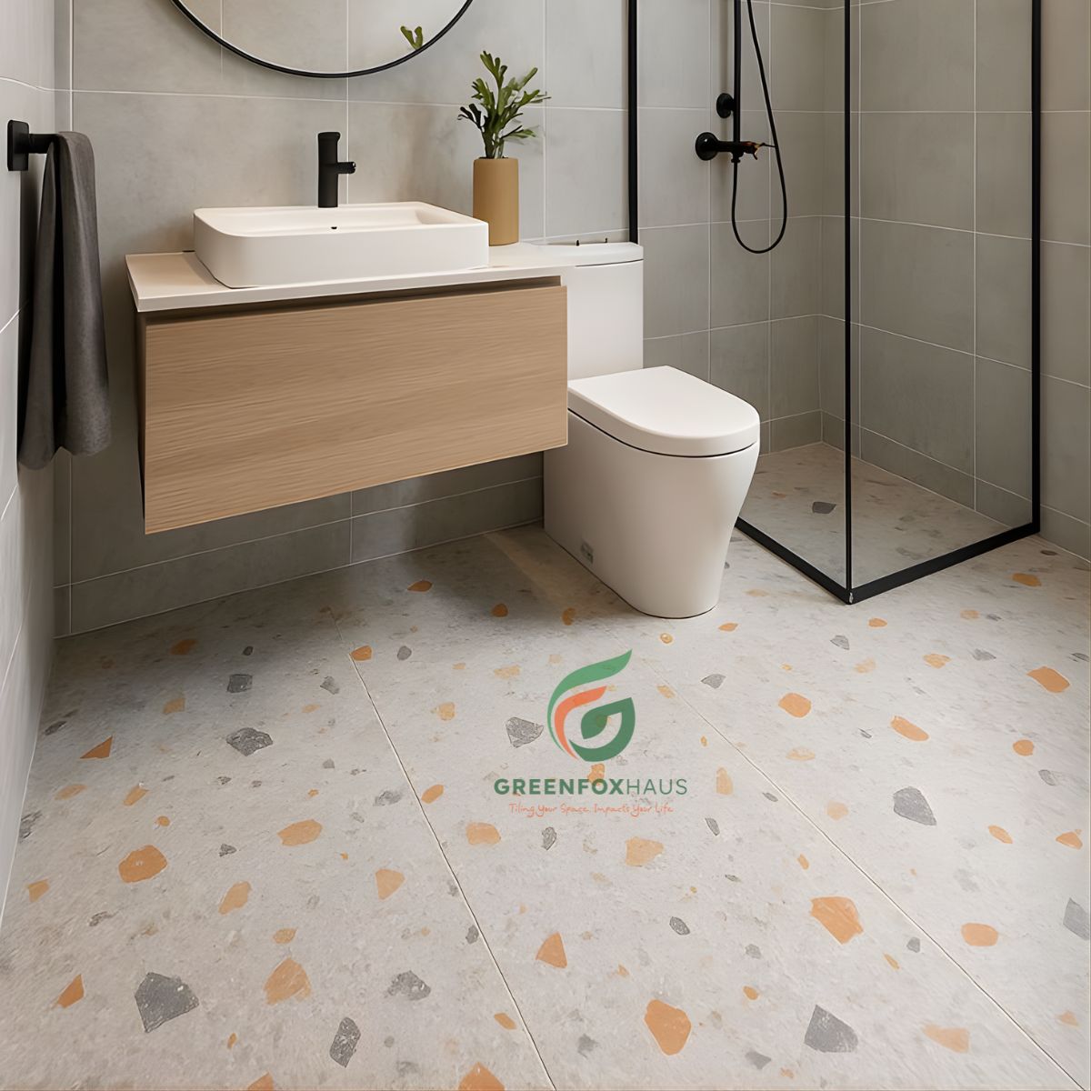 Họa tiết đá hạt độc đáo giúp gạch lát nền toilet trở nên sinh động và trẻ trung. Các mẫu gạch nền nhà vệ sinh terrazzo không chỉ bắt mắt mà còn có khả năng che giấu vết bẩn cực tốt, là giải pháp gạch sàn nhà tắm thông minh cho những gia đình bận rộn.