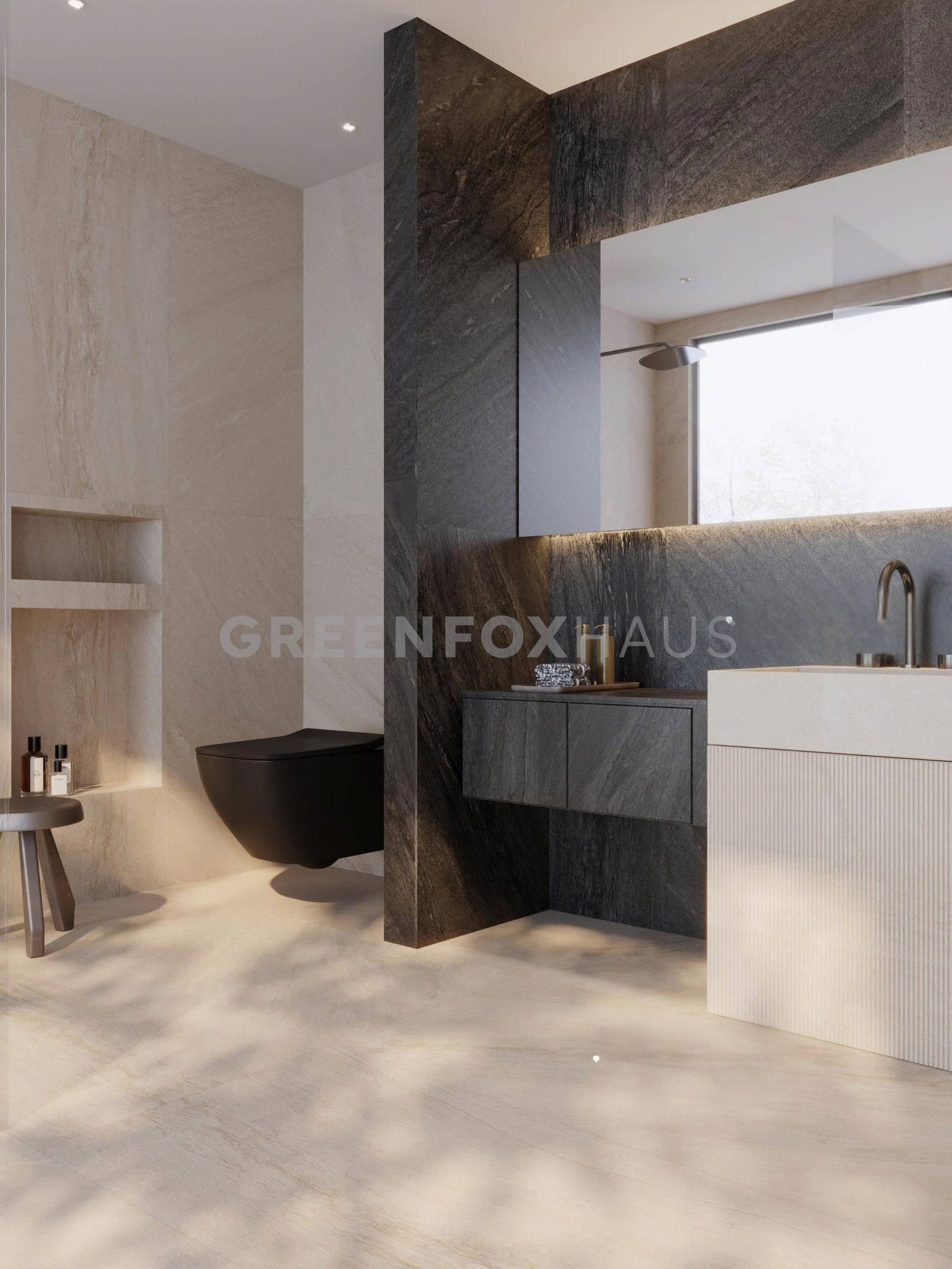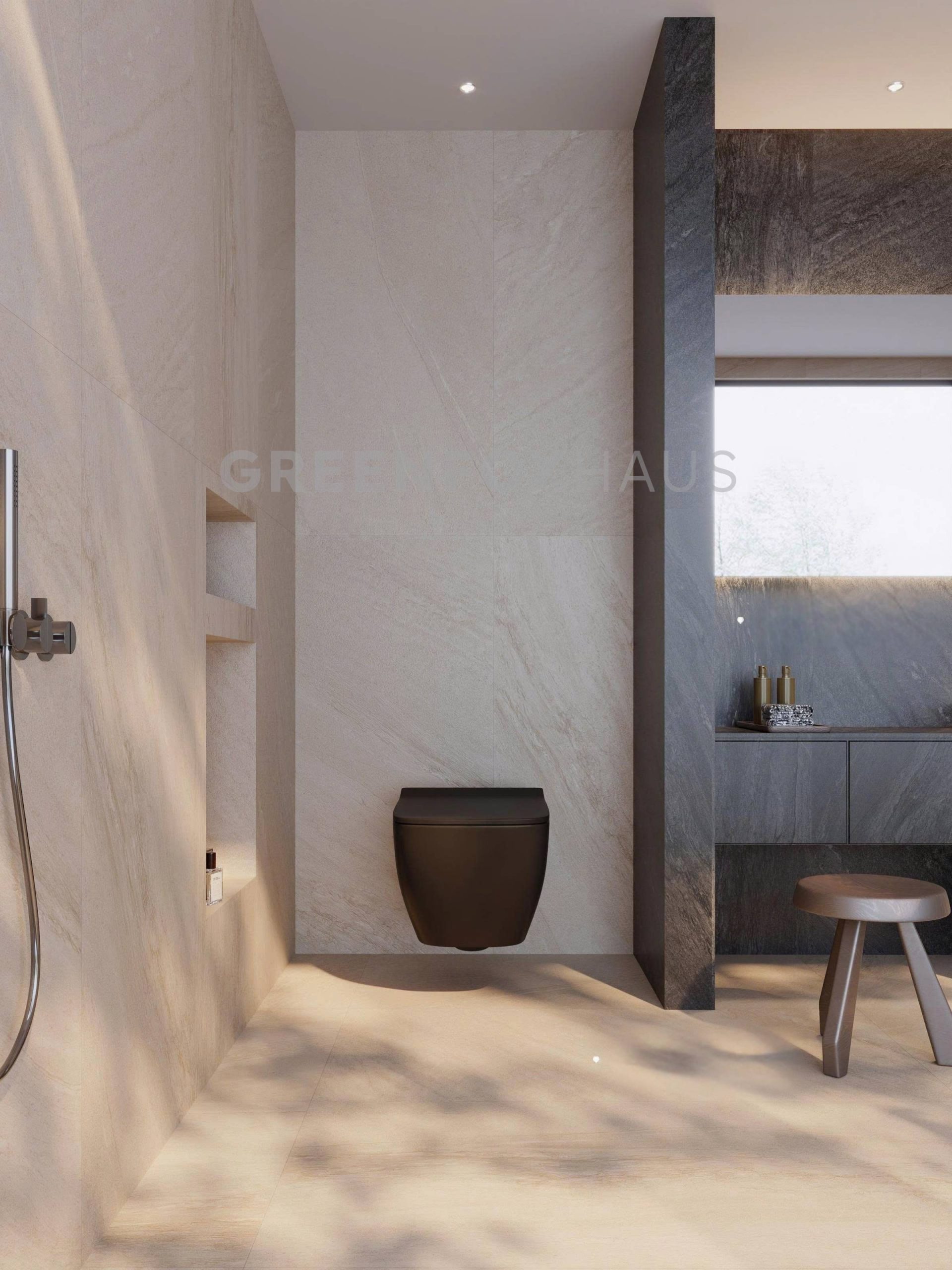 Hệ vân được xử lý tinh tế với độ chuyển sắc nhẹ, không quá tương phản, giúp tổng thể bề mặt hài hòa và không gây rối mắt khi sử dụng trên diện tích lớn. Kích thước 600×1200mm giúp giảm mạch ghép so với gạch truyền thống, mang lại cảm giác không gian liền mạch và gọn gàng hơn.
