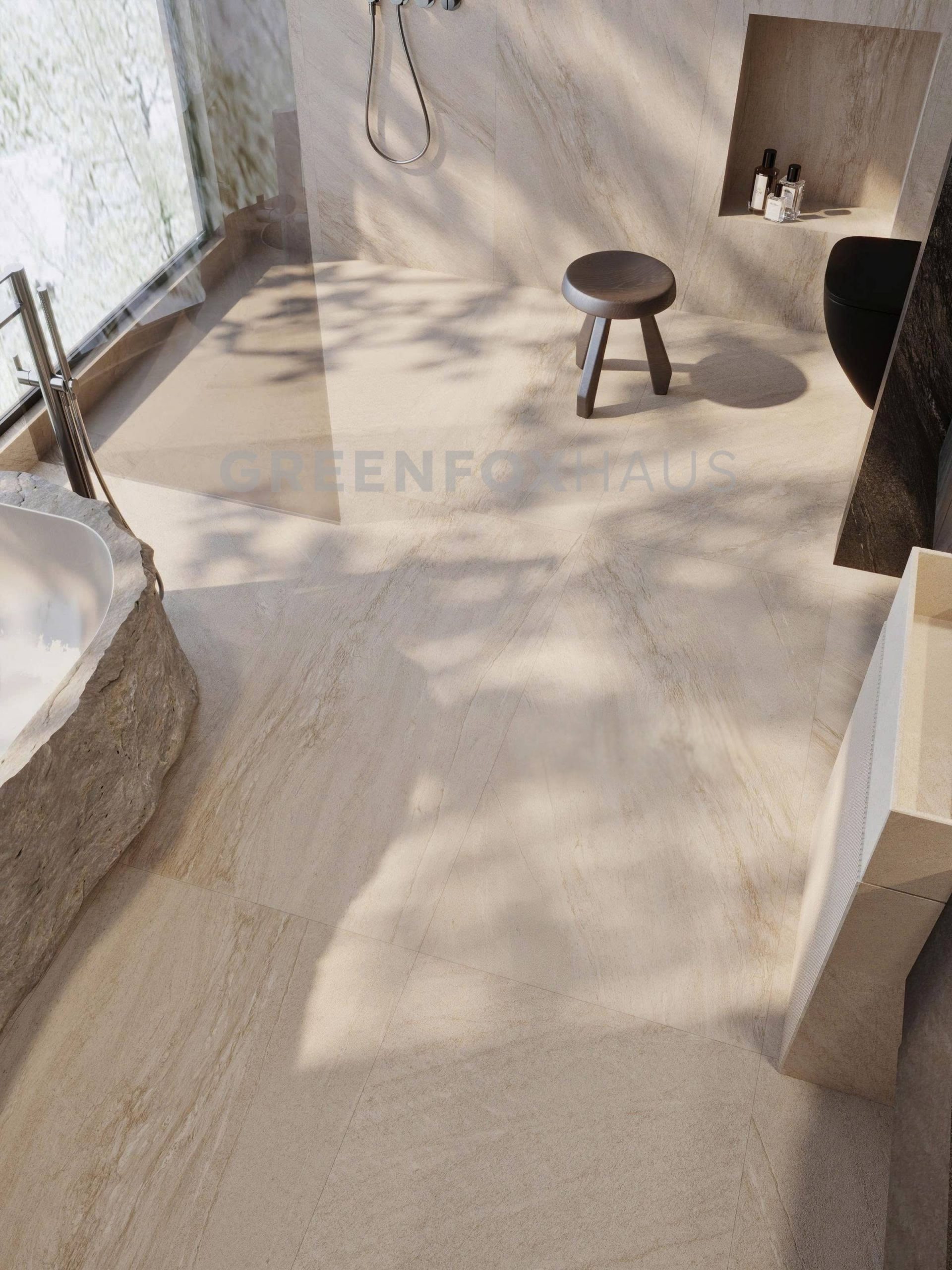 Mẫu gạch GF5.6242 nổi bật với hiệu ứng vân đá tự nhiên dạng lớp nhẹ, các đường vân chạy mềm theo chiều dọc, tạo cảm giác gần gũi và chân thực như bề mặt đá tự nhiên. Tông màu be sáng giúp không gian trở nên ấm áp, dễ chịu và có độ mở tốt, phù hợp với nhiều phong cách thiết kế hiện đại.