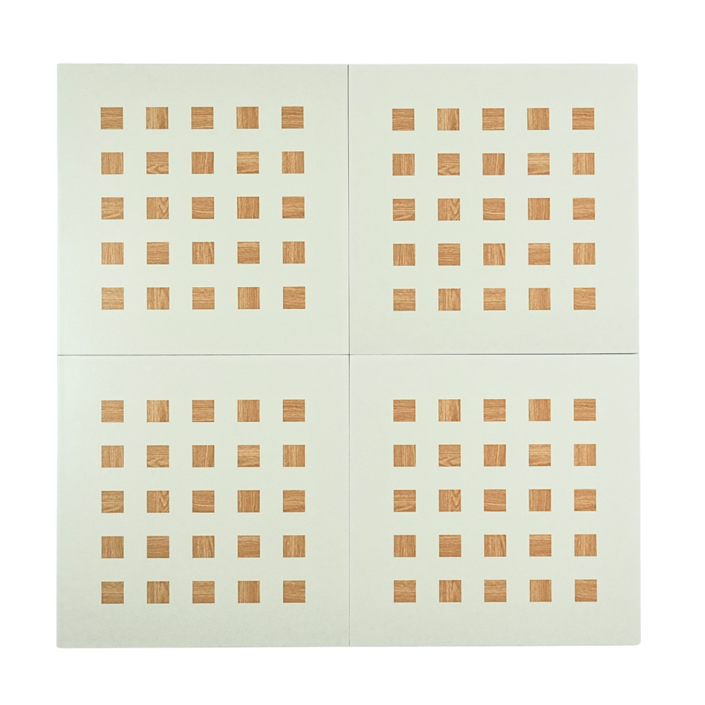 GF.30642 mang màu xanh mint dịu nhẹ kết hợp mô phỏng ô gỗ tự nhiên, lý tưởng cho khu vực spa, phòng ăn gia đình, không gian thiền, showroom vật liệu tự nhiên, quán trà Nhật hoặc khu vực decor theo xu hướng “biophilic design” (thiết kế gần thiên nhiên).