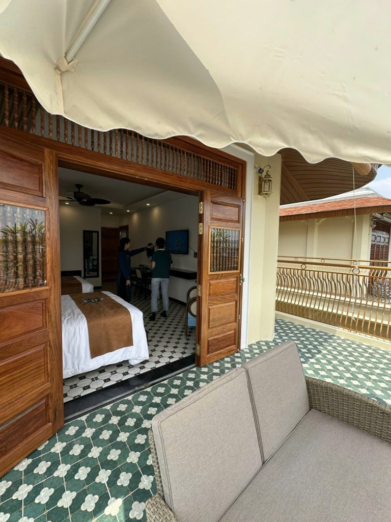 – Gạch bông màu xanh đậm + kim loại giả đồng cho cảm giác premium.