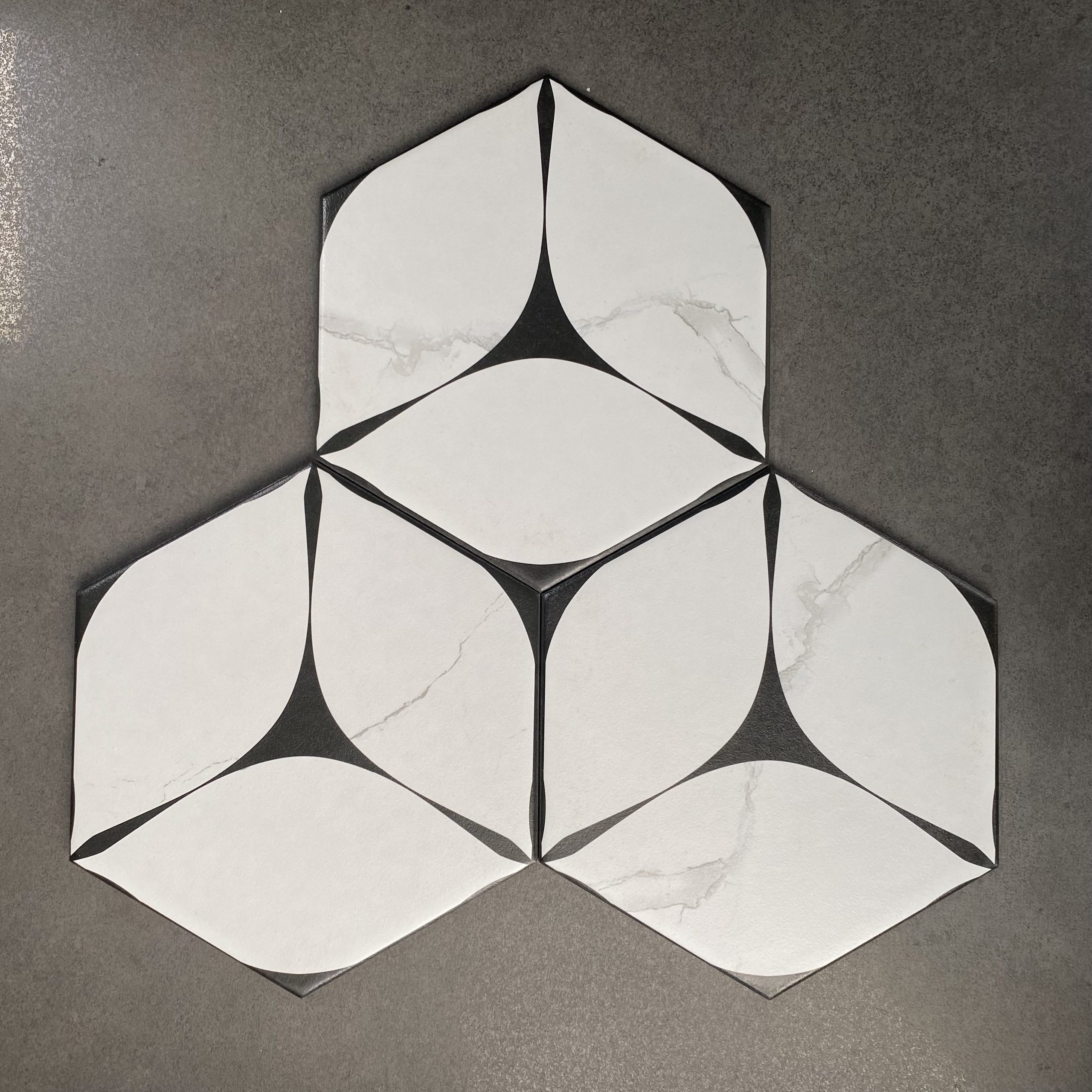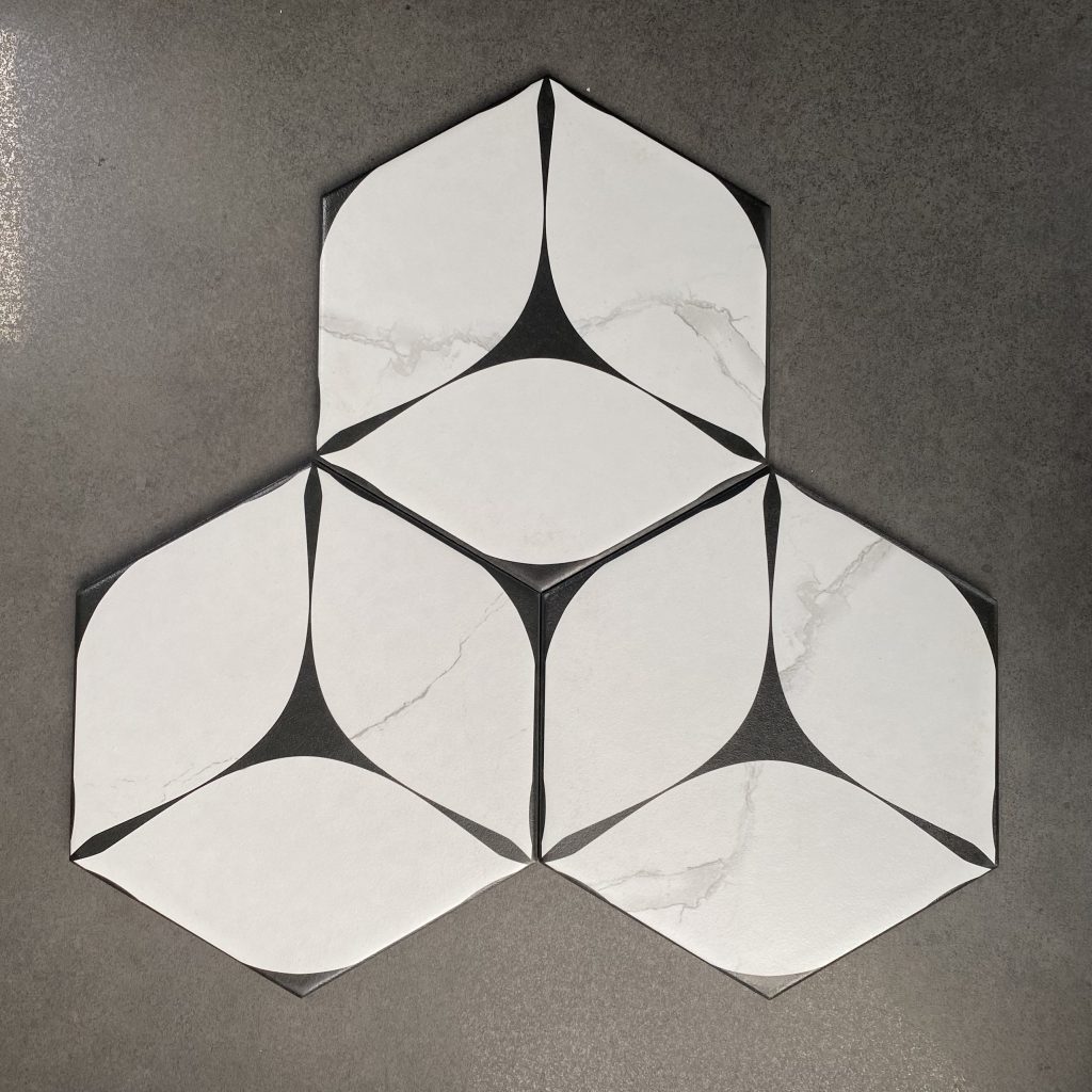GF.FL23057 nổi bật với hình khối lục giác kết hợp đường cong mềm mại khi ghép lại tạo hiệu ứng “3D xoáy tâm” vô cùng ấn tượng. Phù hợp cho không gian muốn tạo điểm nhấn sàn hoặc tường nghệ thuật như: