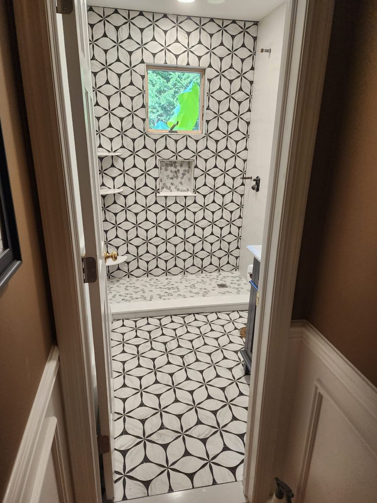 Khi ứng dụng đúng nguồn sáng (đèn rọi trần hoặc ánh sáng tự nhiên), họa tiết hình học của gạch được “đánh thức”, tạo chiều sâu và hiệu ứng thị giác mạnh – rất hợp với phong cách Contemporary, Art-Decor, Neo Modern.