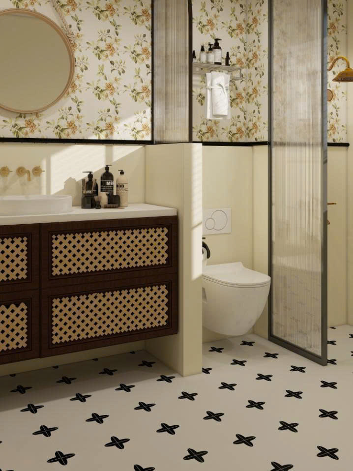 GF.MF3014 được sử dụng chủ yếu làm gạch viền hoặc bo góc, giúp định hình bố cục lát nền trong phong cách Indochine hoặc Mosaic. Phù hợp thi công tại hành lang khách sạn, khu vực tiếp khách villa, phòng trà đạo, quầy bar, hoặc dùng để tạo phân tách khu vực trong thiết kế sàn.