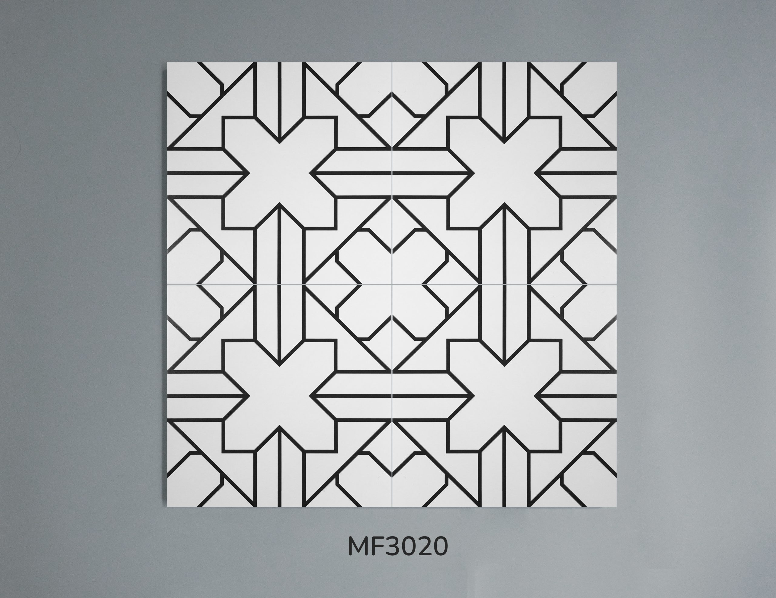 GF.MF3020 với thiết kế cách điệu dạng hình học màu đen trên nền trắng, phù hợp với không gian kiến trúc hiện đại, quán cà phê sáng tạo, studio thiết kế, nhà phố phong cách minimal hoặc industrial. Lát nền liên hoàn tạo hiệu ứng phối cảnh mạnh mẽ, thích hợp cho không gian muốn thể hiện cá tính và sự táo bạo.