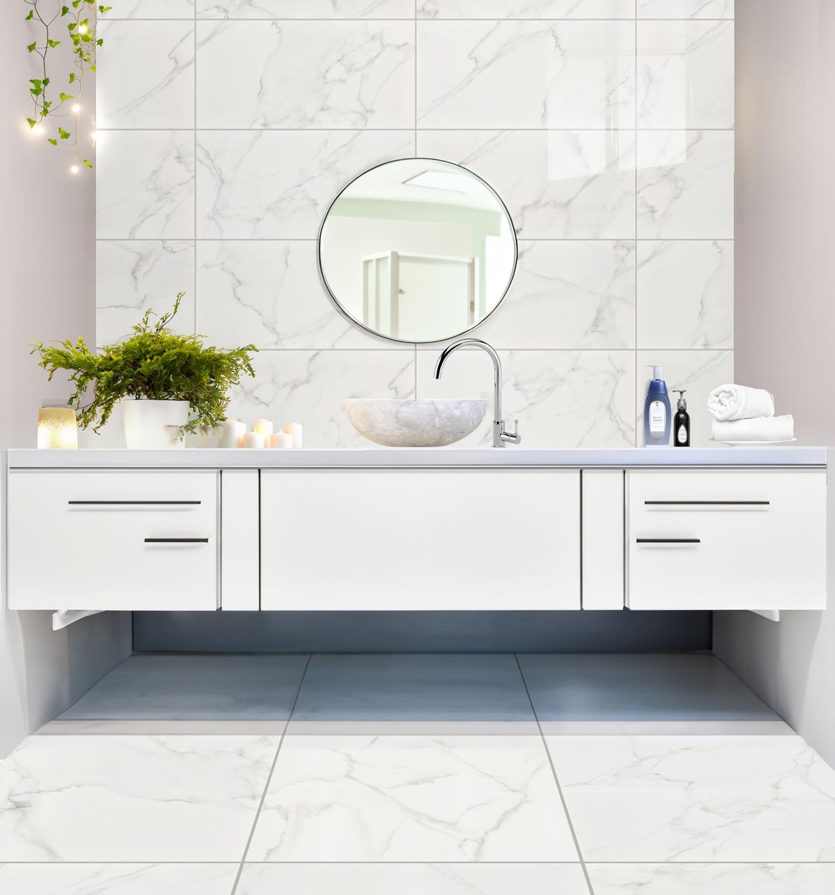 Vân đá marble hợp với ai muốn phòng tắm có cảm giác sang hơn nhưng vẫn dễ phối đồ. Tông trắng–xám–xám xanh nhạt thường rất “dễ đẹp”, phối với thiết bị vệ sinh trắng hoặc phụ kiện đen nhám đều hợp. Nếu dùng cho khu vực dễ bắn nước, chọn marble men mịn hoặc matt sẽ nhìn tinh tế và ít thấy vệt hơn.