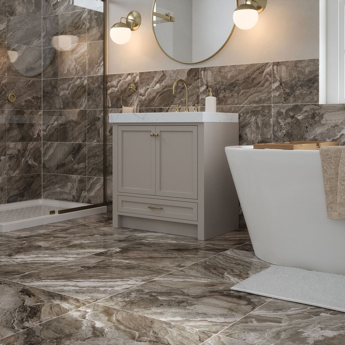 Phòng tắm nhỏ thường hợp tông sáng như trắng, kem, xám nhạt, be để nhìn thoáng và sạch. Nếu thích tông đậm (xám than, nâu, đen), nên dùng theo kiểu mảng nhấn để tạo chiều sâu mà không làm không gian nặng. Về kiểu vân, vân đá (marble/stone) là nhóm dễ phối và ít lỗi mốt; vân xi măng/bê tông cho cảm giác hiện đại, sạch lâu; terrazzo tạo điểm nhấn trẻ; vân gỗ giúp ấm và thư giãn.