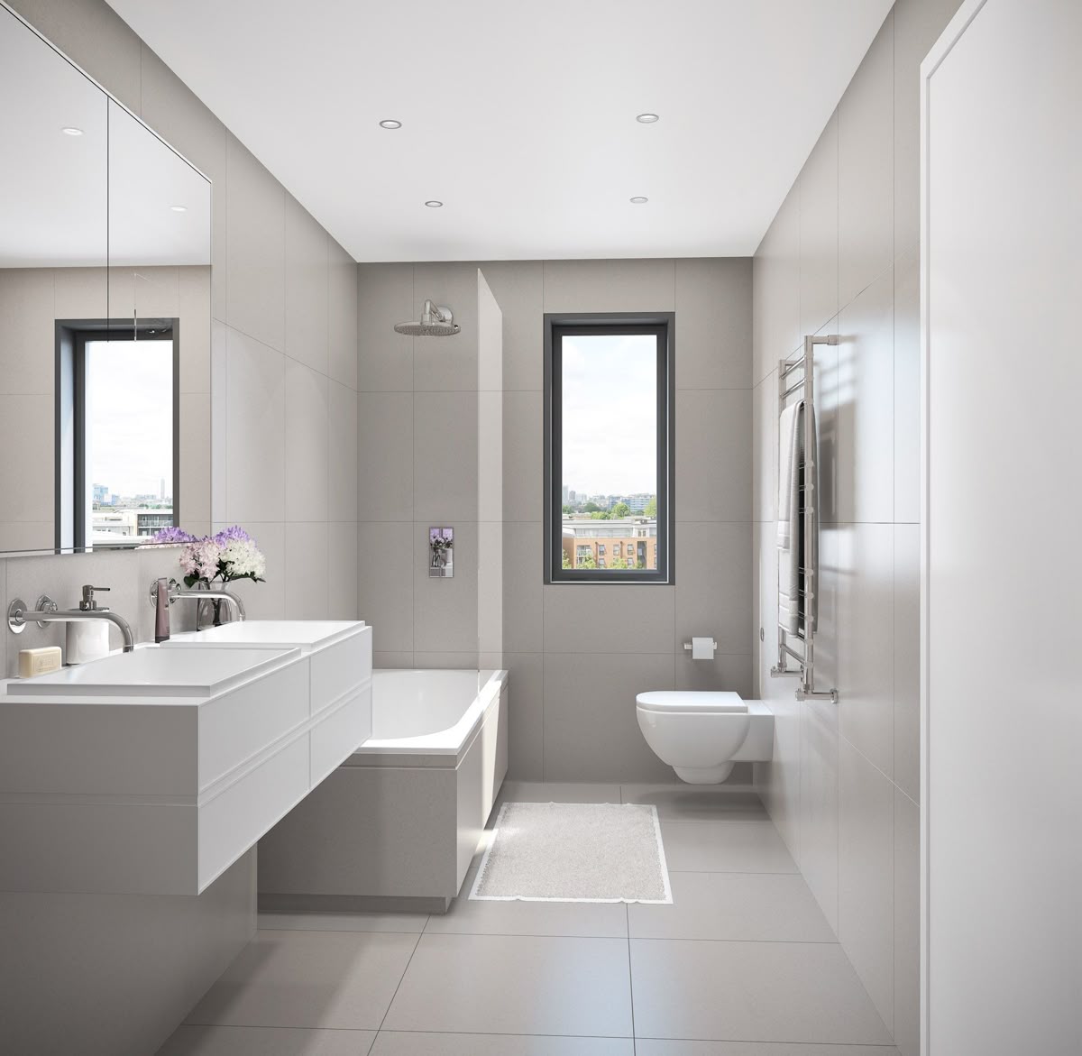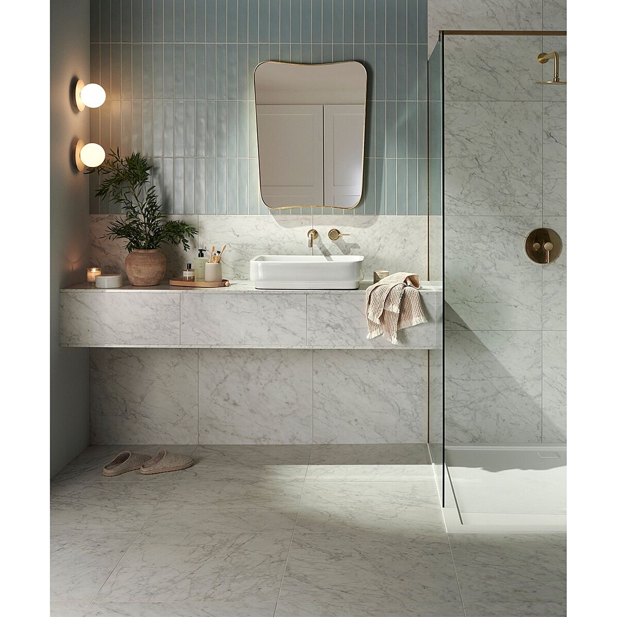 Cho cảm giác “đầm tường”, ít đường ron nên tổng thể nhìn gọn và chắc hơn. Phù hợp nhà vệ sinh vừa–rộng, hoặc phong cách tối giản cần mảng tường ít chia ô. Lưu ý khổ này đẹp nhất khi tường phẳng và canh ron đều để mảng không bị “chia lệch” khi nhìn xa.