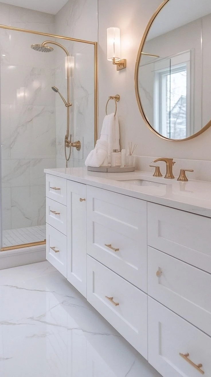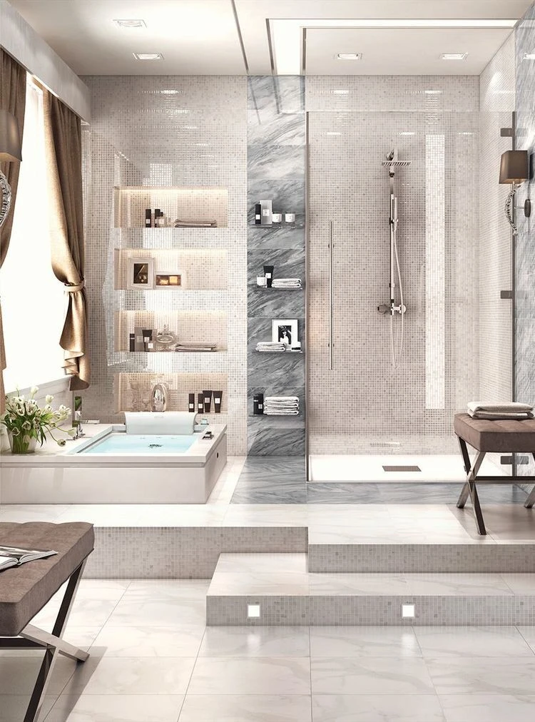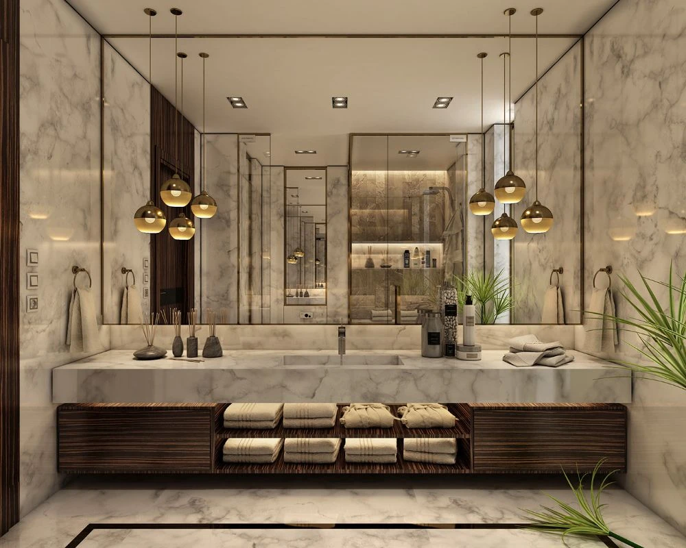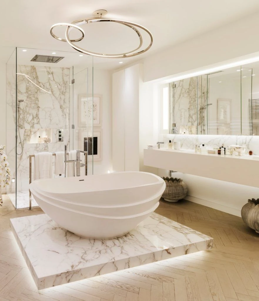 Phong cách Classic khiến nhà tắm trở nên trang nhã và vượt thời gian</strong>. Đá marble tinh xảo, đường nét đối xứng và gam trắng – be thanh lịch kết hợp, tạo nên sự sang trọng bền vững qua năm tháng.