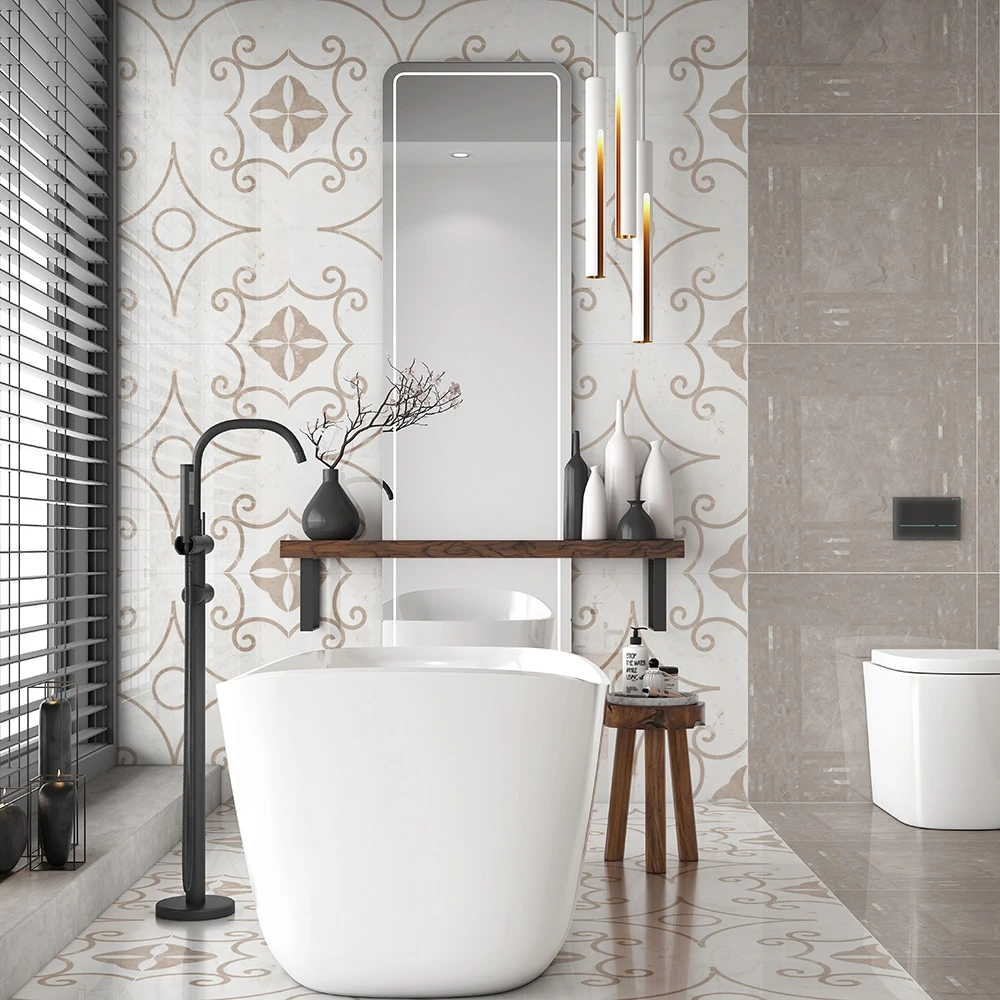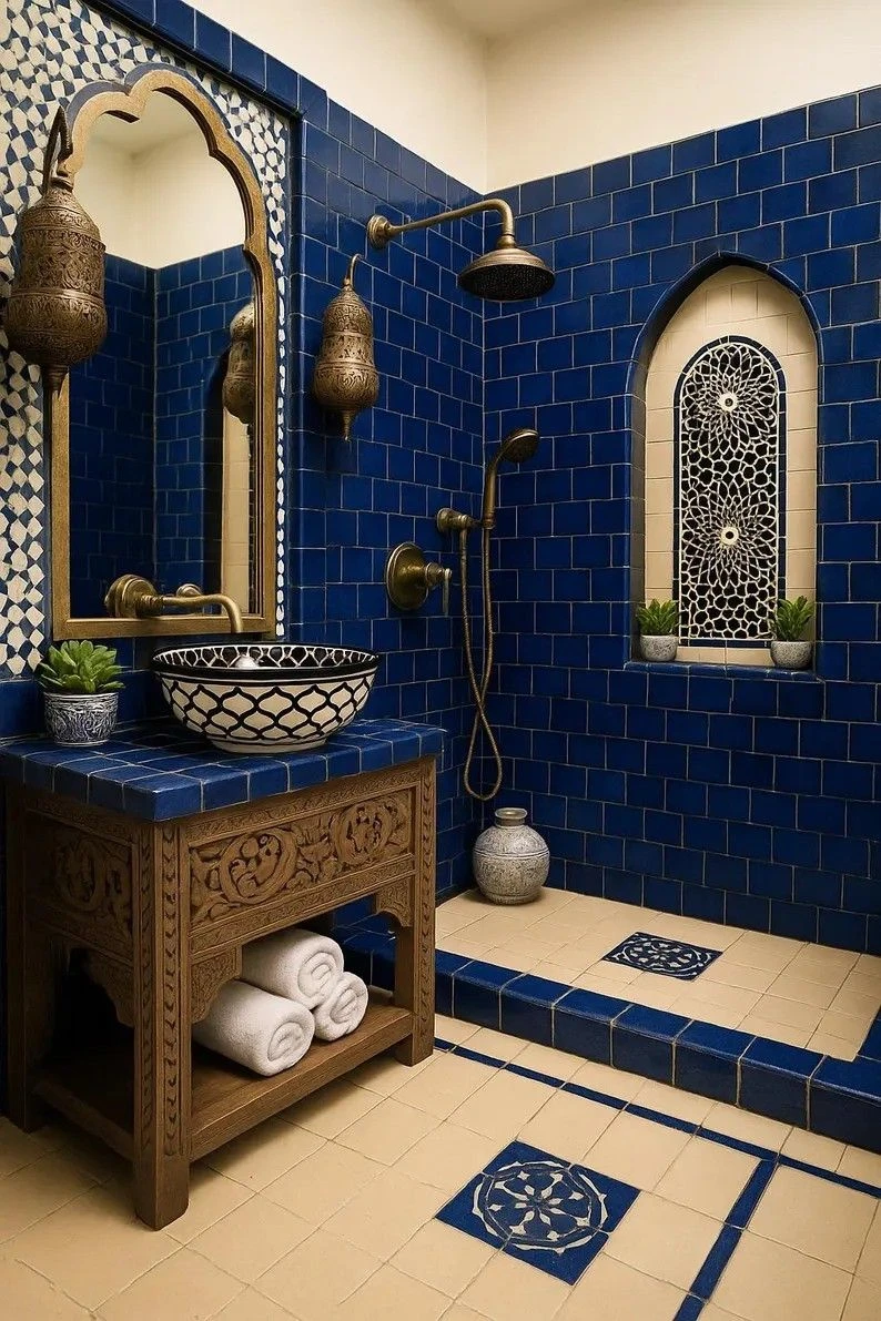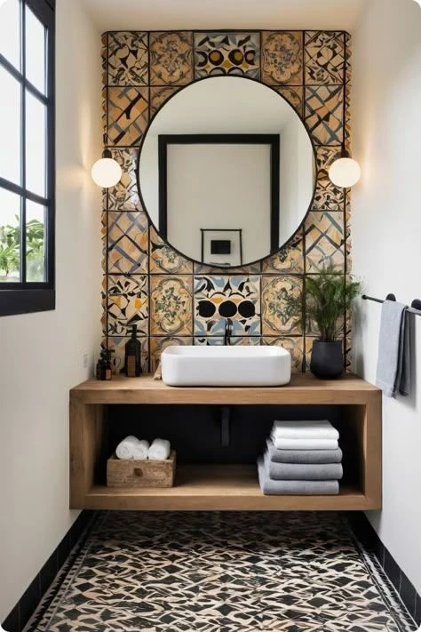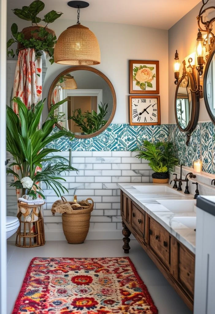 Phòng tắm Boho cổ điển toát lên sự tự do qua gạch ốp paisley duyên dáng, bồn rửa đá cẩm thạch sang trọng và gương cổ điển tinh tế.