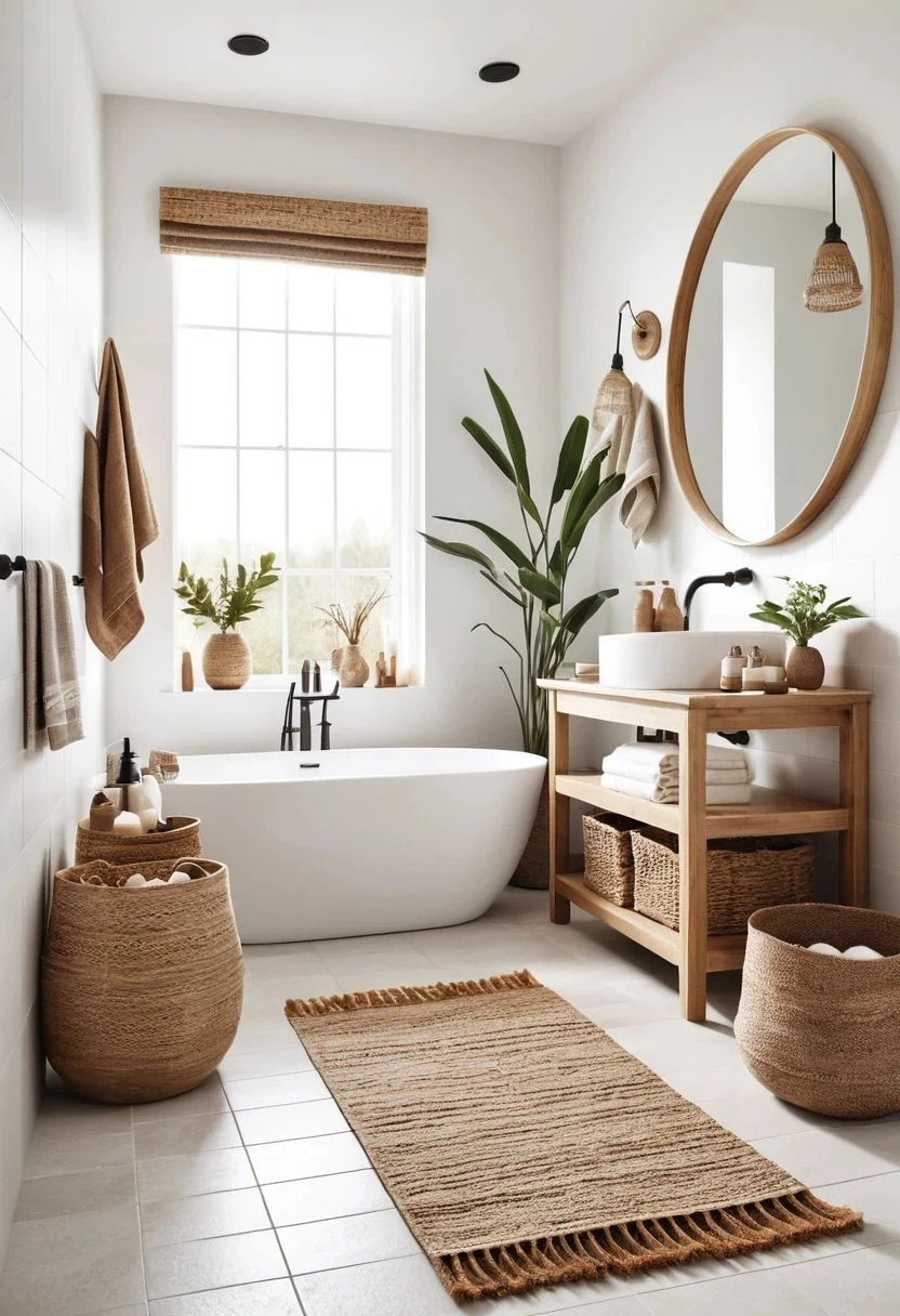 Không gian thêm phần ấm áp nhờ thảm dệt tay nhiều màu, giỏ mây tre đựng đồ và chậu cây xanh nhỏ đặt cạnh bồn rửa.