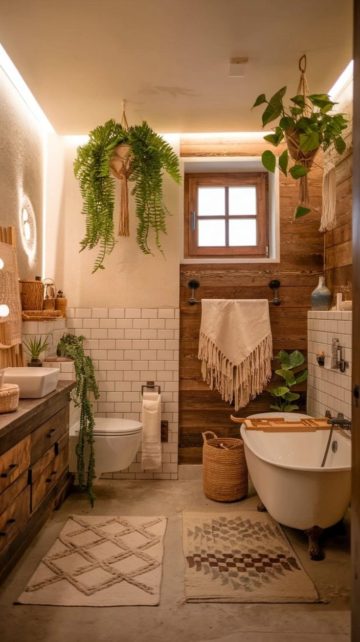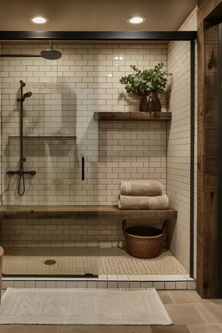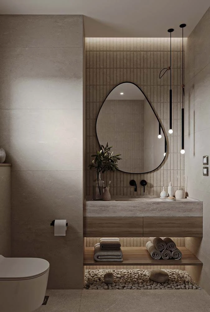 Không gian trở nên hài hòa khi những vật liệu mộc mạc được kết hợp cùng bồn rửa tối giản, vòi sen sáng bóng và ánh sáng vàng nhẹ, tạo nên sự cân bằng giữa nét nguyên sơ và tiện nghi hiện đại.
