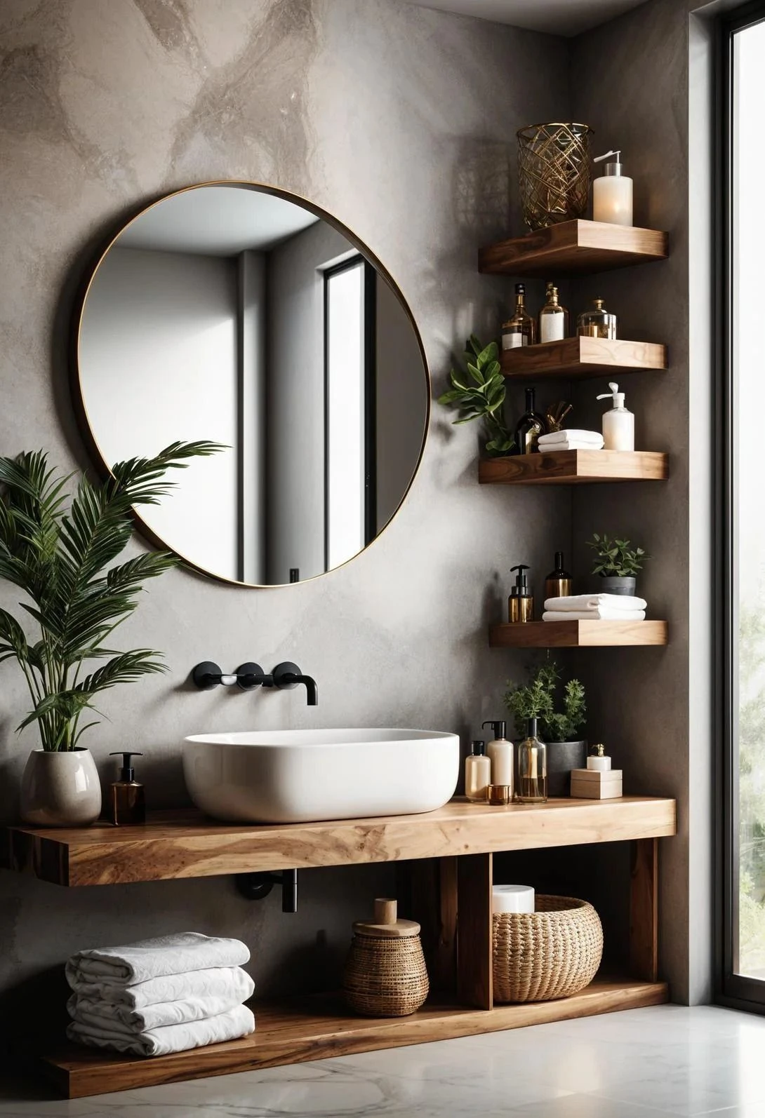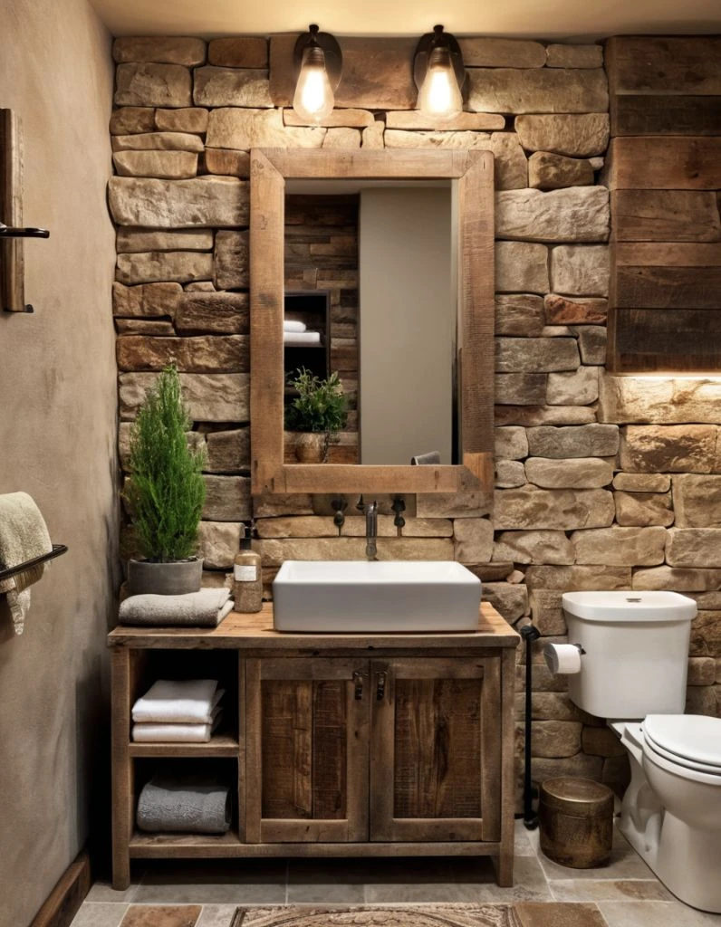 Phòng tắm Rustic gợi cảm giác gần gũi nhờ đá phiến thô ráp, gỗ mộc tự nhiên và gam màu nâu – xám trầm ấm.