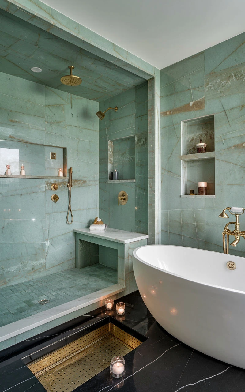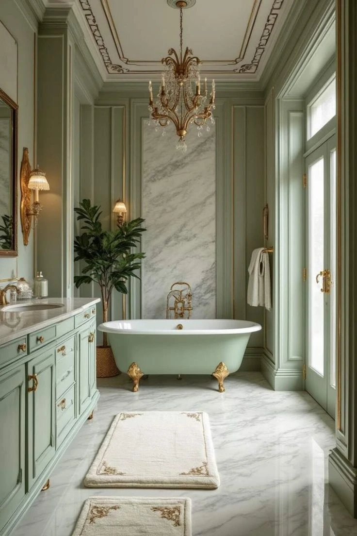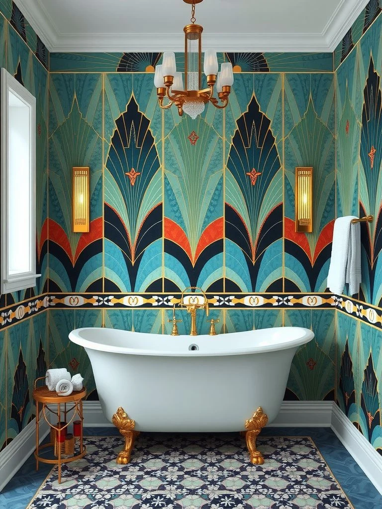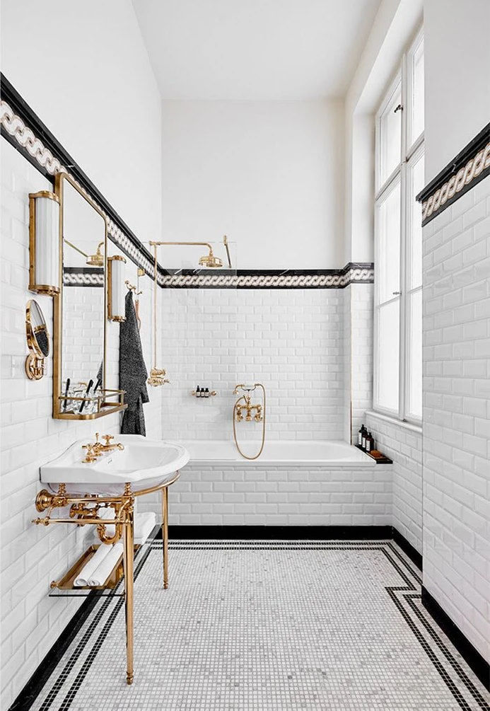 Phòng tắm phong cách Art Deco toát lên vẻ quyến rũ đầy kịch tính nhờ sự kết hợp giữa gạch ốp lát ánh kim, chi tiết trang trí hình học táo bạo và những đường cong mềm mại.