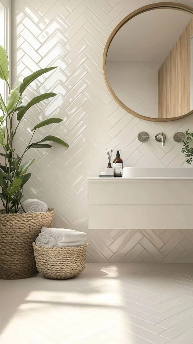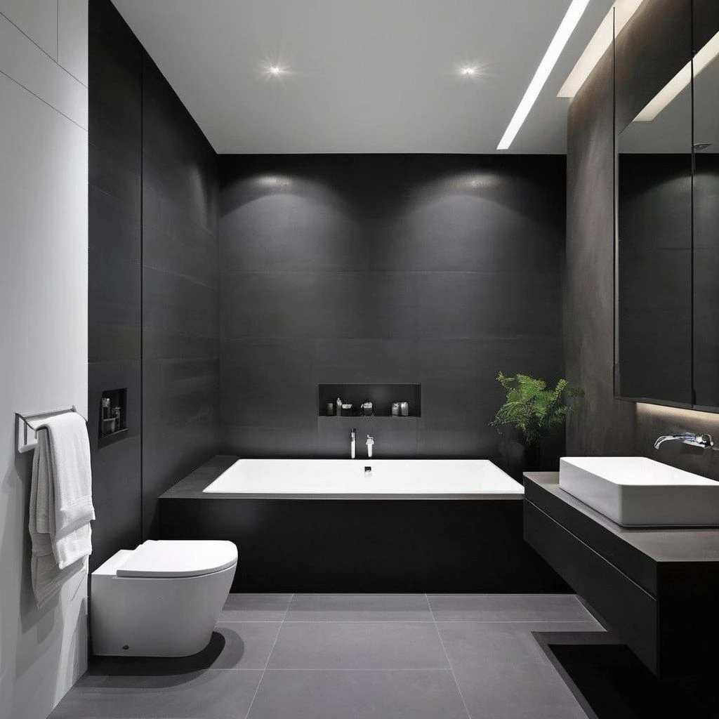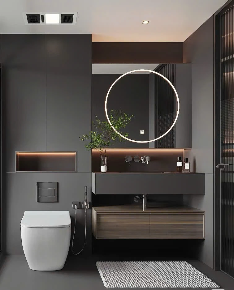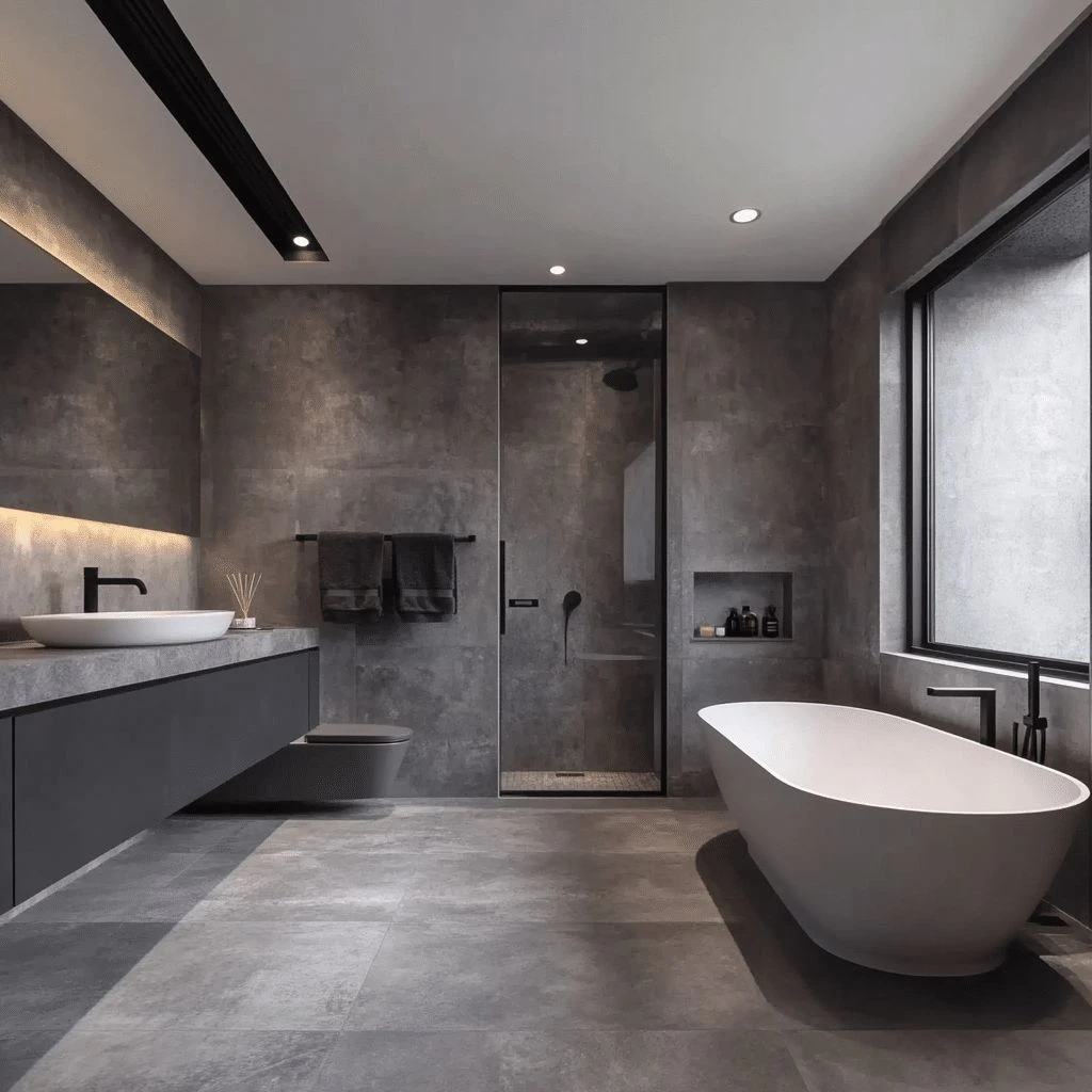 Phong cách phòng tắm Minimalist chinh phục bằng sự tối giản tuyệt đối: gam màu trung tính, đường nét gọn gàng và ánh sáng tinh tế. Sàn lát gạch 60×60 mờ phẳng lì, tường phủ gạch thẻ đơn sắc gọn gàng, mọi chi tiết thừa đều được lược bỏ.