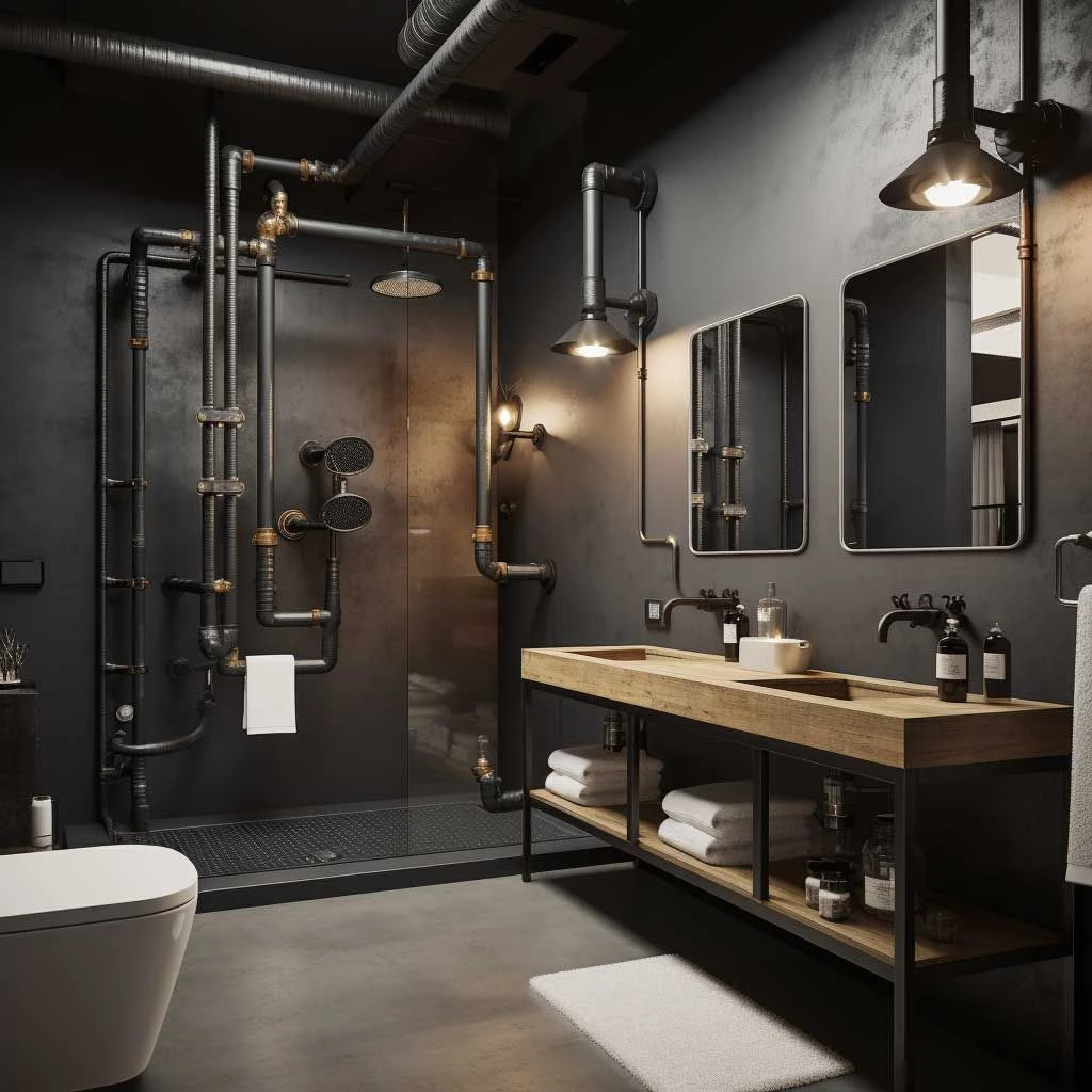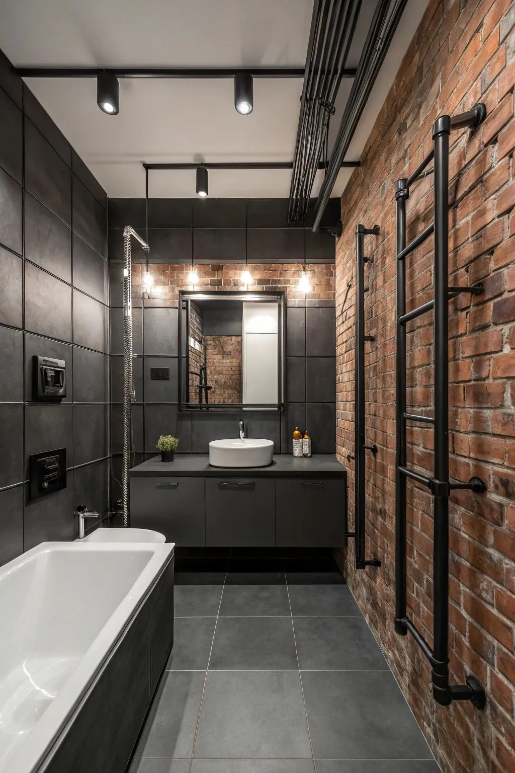 Phong cách phòng tắm Industrial cá tính với bê tông trần, gạch thô và thép lộ thiên, gợi nên vẻ đẹp mạnh mẽ và hiện đại.