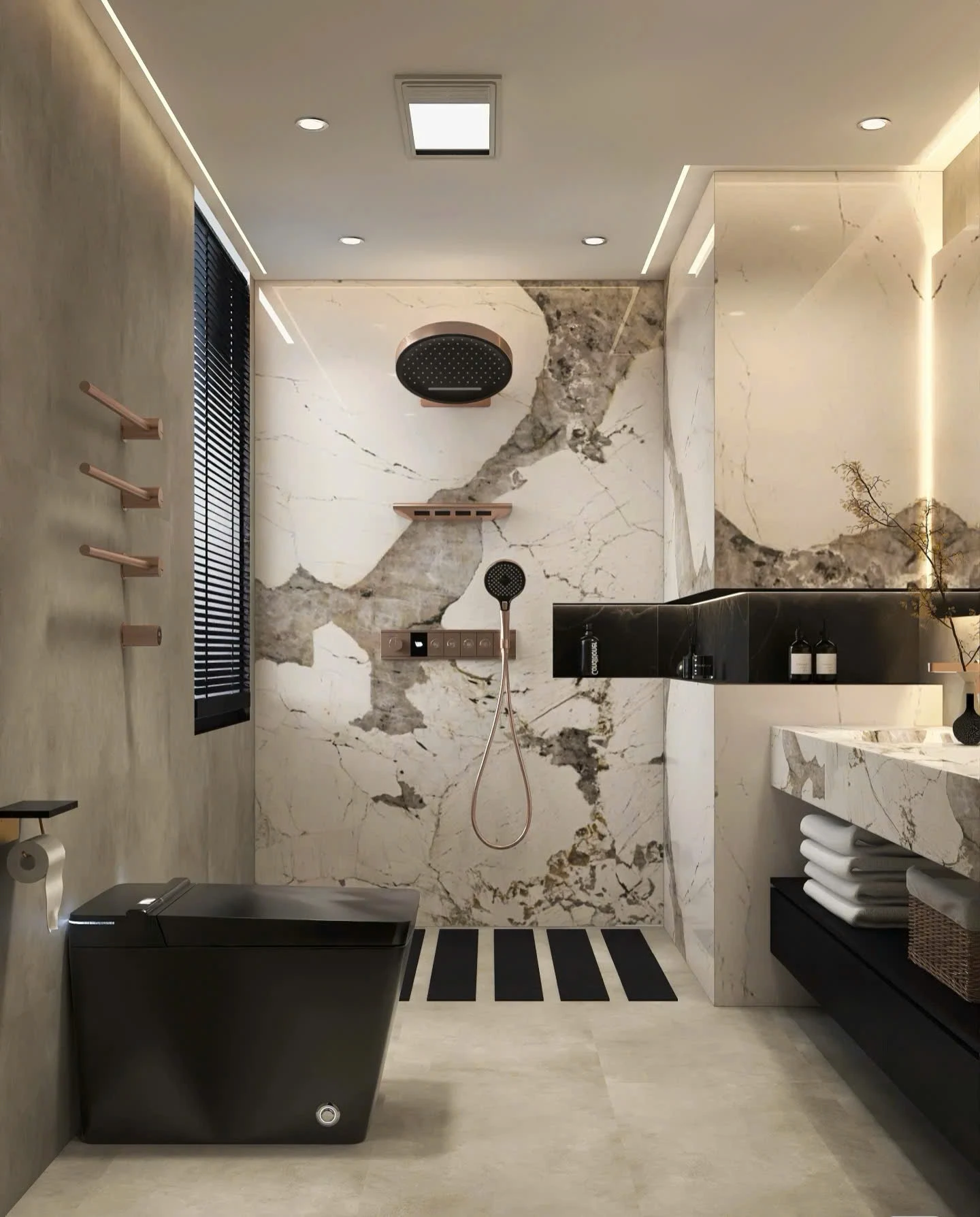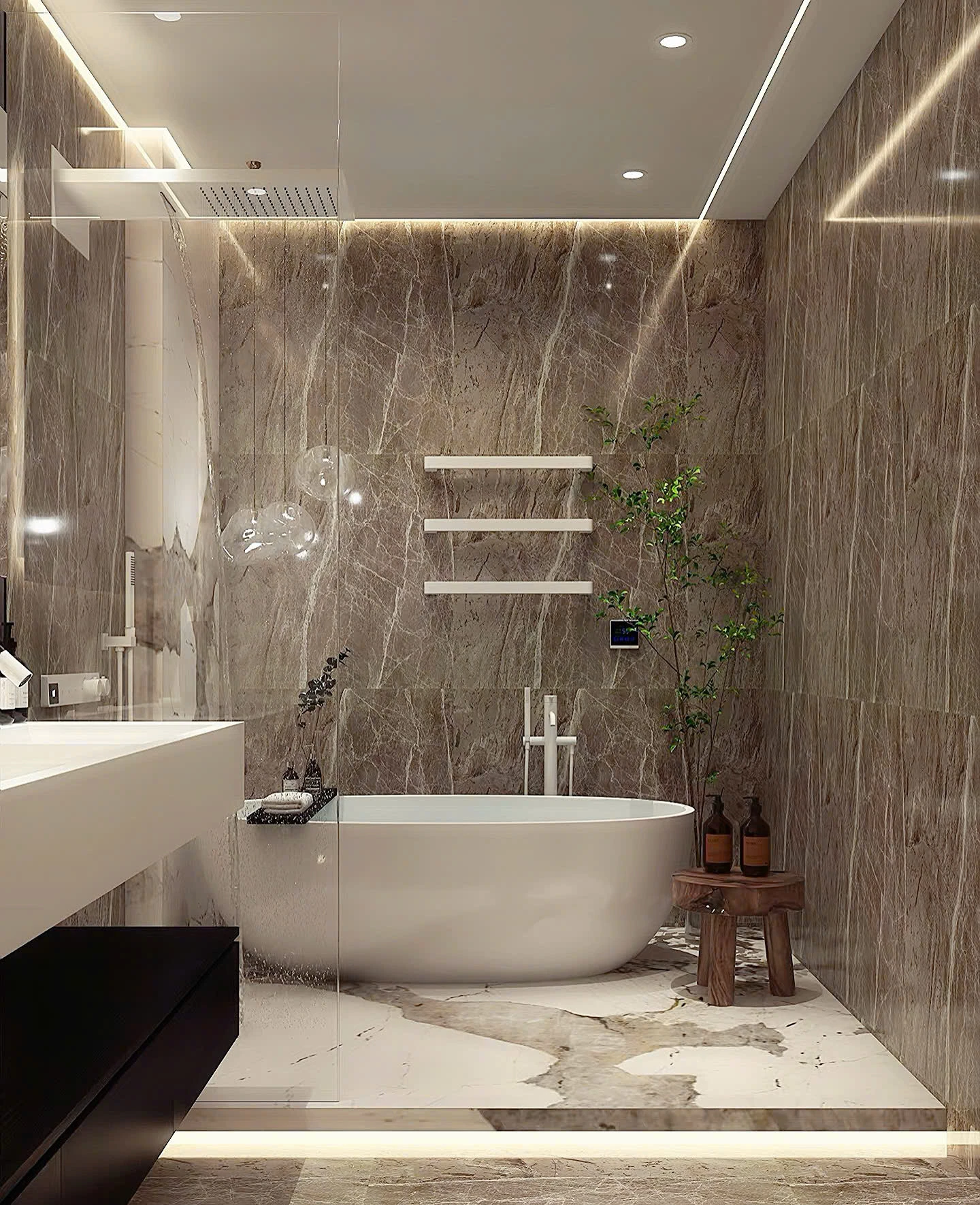 Modern là sự kết hợp của kính trong suốt, kim loại sáng bóng và gạch khổ lớn. Phòng tắm rộng mở, thoáng sáng, vừa tiện nghi, vừa phản ánh lối sống năng động và hiện đại.