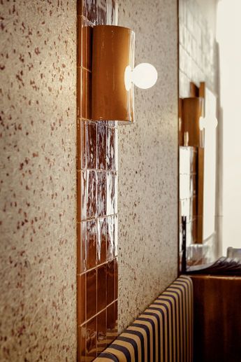 Ngay cả trong không gian nhỏ, gạch gợn sóng vẫn giúp bức tường có độ sâu, ánh sáng phản chiếu khiến căn phòng trông rộng hơn.