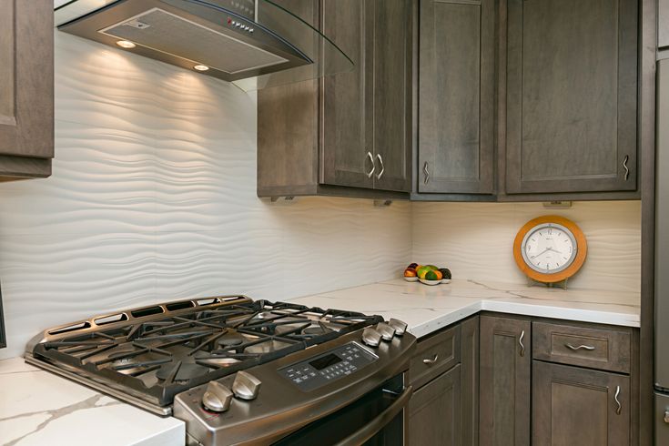Ốp backsplash bếp bằng gạch ripple pastel (mint, hồng đất, trắng sữa) – dễ vệ sinh, phản sáng tốt, tạo cảm giác sạch và tươi mới.