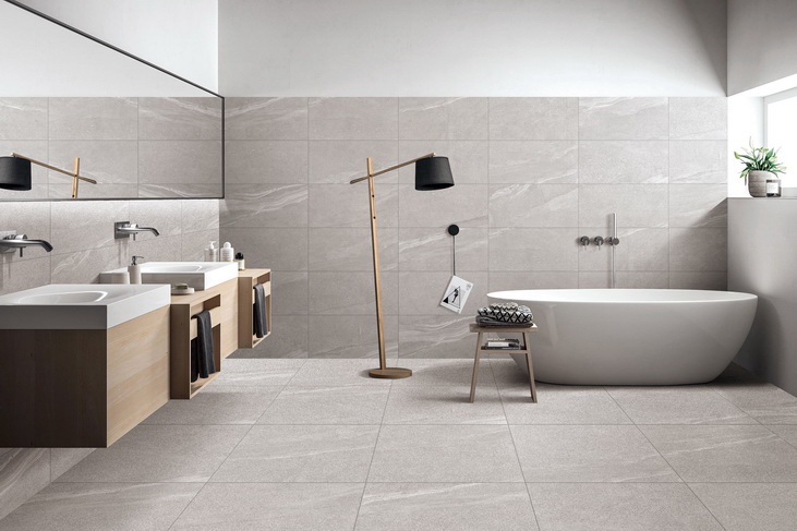 Kiểu vân: Stone Look – tông xám lạnh, đường vân loang nhẹ, tự nhiên như phiến đá nguyên khối.