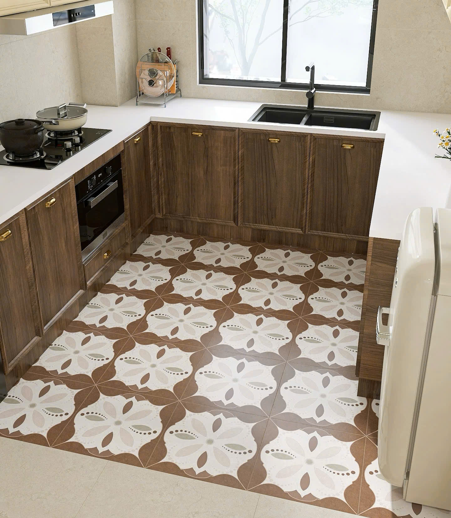 GF.MFG405 mang phong cách retro sang trọng, kết hợp giữa hoa văn nghệ thuật và khung viền vân gỗ đầy ấm áp. Mỗi viên gạch là một điểm nhấn tinh tế, giúp không gian vừa gần gũi vừa mang hơi thở hoài cổ.