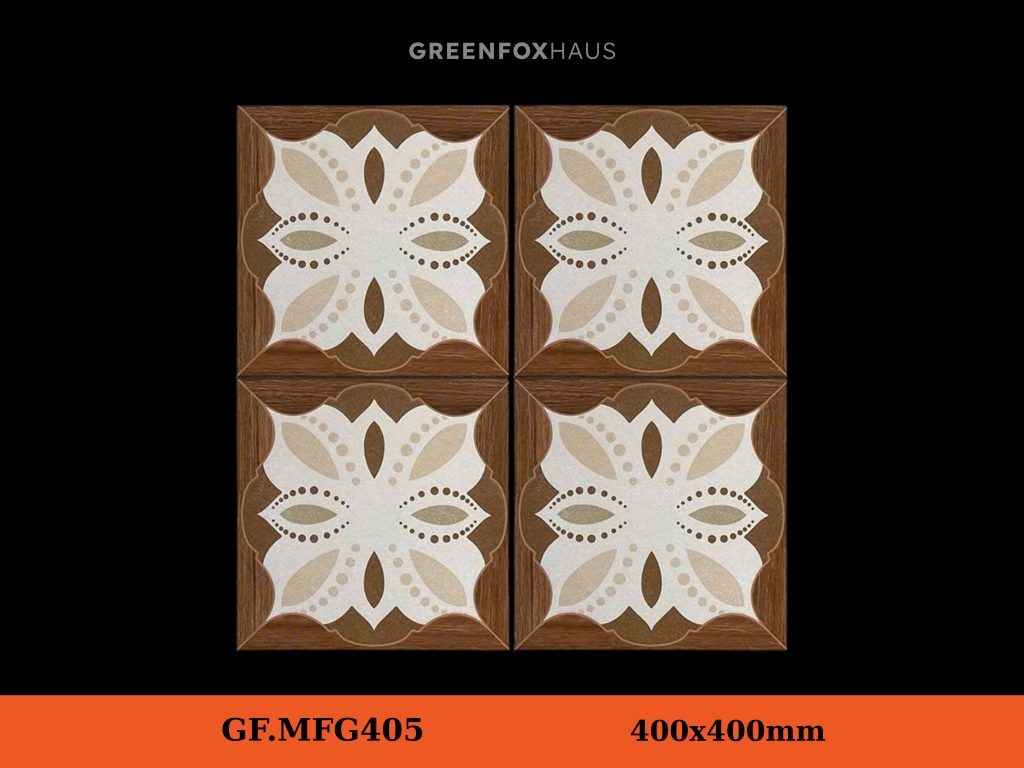 GF.MFG405 mang phong cách retro sang trọng, kết hợp giữa hoa văn nghệ thuật và khung viền vân gỗ đầy ấm áp. Mỗi viên gạch là một điểm nhấn tinh tế, giúp không gian vừa gần gũi vừa mang hơi thở hoài cổ.