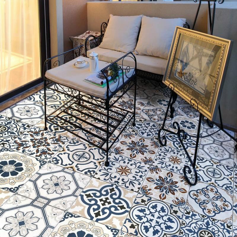 Mỗi viên gạch mang một họa tiết khác biệt – hoa văn uốn lượn, gam xanh navy – be – xám tro hòa quyện tinh tế, tạo nên bức tranh nền đầy sức sống và cá tính.
