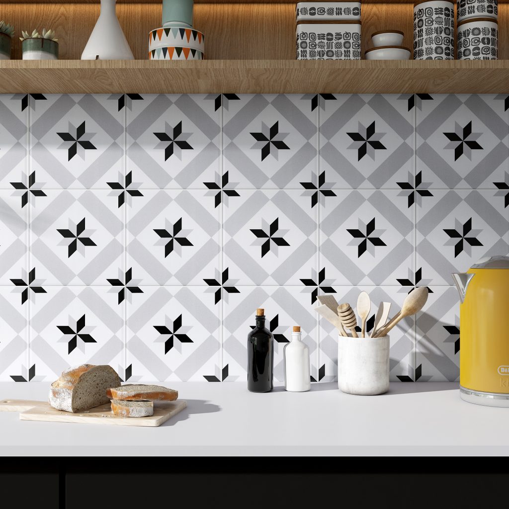 GF.DC260 là mẫu gạch bông 200×200 mang tinh thần hiện đại và tối giản với họa tiết ngôi sao cách điệu cùng tông xám – trắng – đen trung tính. Thiết kế hình học đối xứng giúp không gian trở nên hài hòa, trật tự nhưng vẫn có chiều sâu thẩm mỹ, phù hợp cho nhiều phong cách kiến trúc đương đại.
