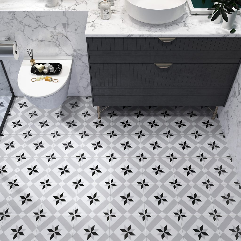 GF.DC260 là mẫu gạch bông 200×200 mang tinh thần hiện đại và tối giản với họa tiết ngôi sao cách điệu cùng tông xám – trắng – đen trung tính. Thiết kế hình học đối xứng giúp không gian trở nên hài hòa, trật tự nhưng vẫn có chiều sâu thẩm mỹ, phù hợp cho nhiều phong cách kiến trúc đương đại.