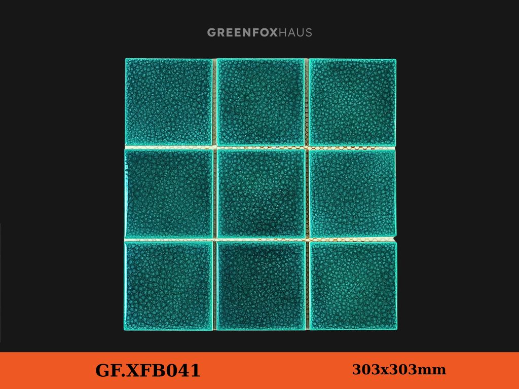 Mẫu GF.XFB041 mang sắc xanh Aqua sâu, khi gặp ánh sáng tạo hiệu ứng lung linh như mặt nước. Bề mặt men rạn tự nhiên giúp từng viên gạch giống như “những mảnh thủy tinh thu nhỏ”, rất nổi bật khi lên công trình.