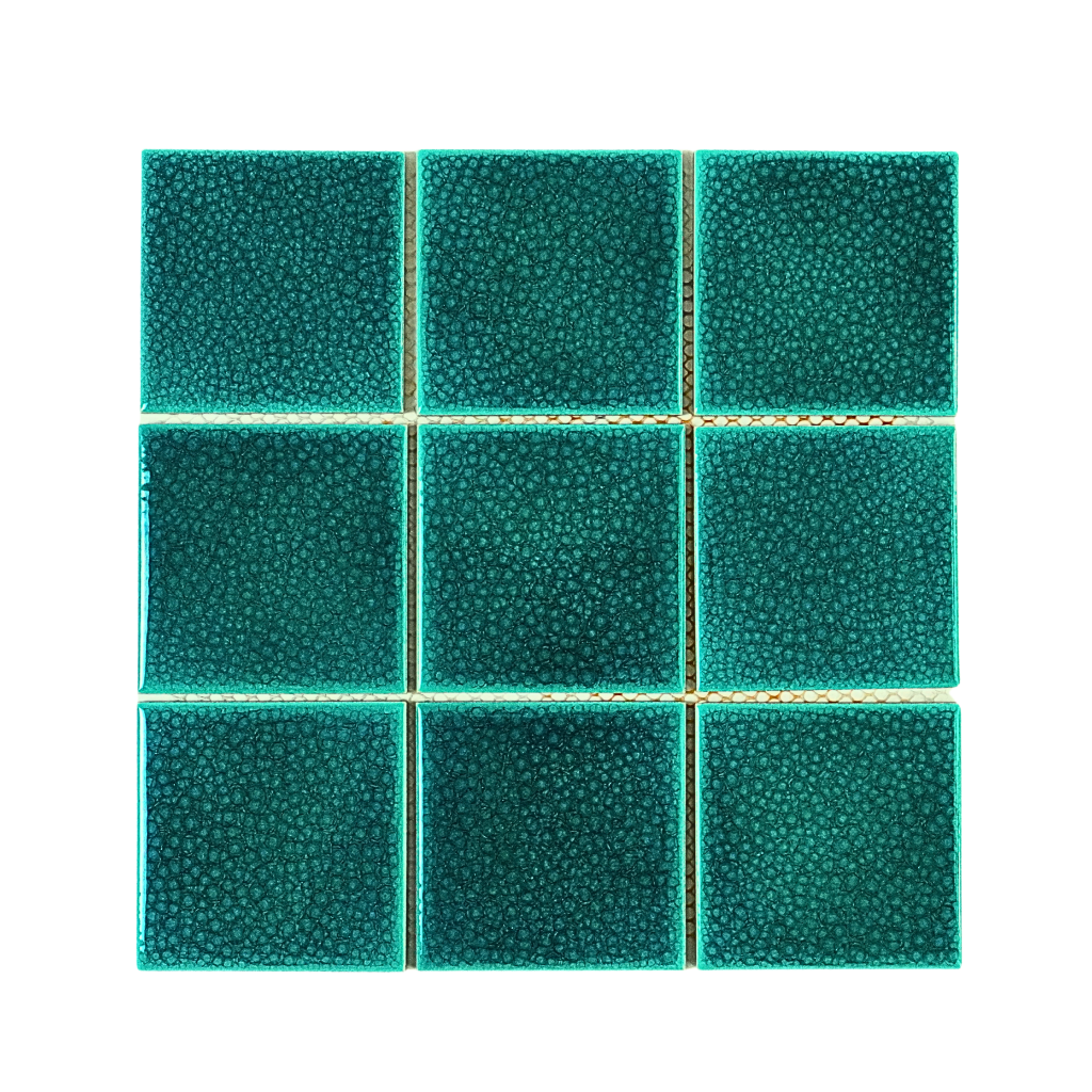 Mẫu GF.XFB041 mang sắc xanh Aqua sâu, khi gặp ánh sáng tạo hiệu ứng lung linh như mặt nước. Bề mặt men rạn tự nhiên giúp từng viên gạch giống như “những mảnh thủy tinh thu nhỏ”, rất nổi bật khi lên công trình.
