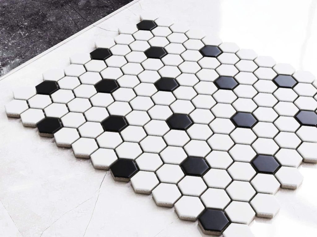 Mẫu GF29.HXA03 là phiên bản gạch mosaic lục giác mini trắng – đen mang phong cách Retro kết hợp Minimalist hiện đại.