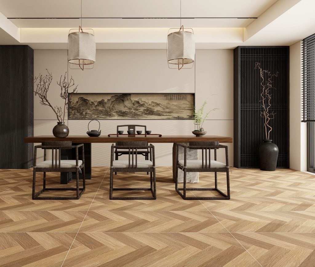 Thiết kế vân xương cá (Herringbone) mang lại nhịp điệu thị giác độc đáo, tạo cảm giác chuyển động nhẹ nhàng và hiện đại cho mọi không gian.